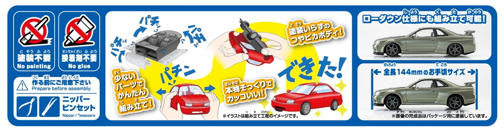 The R34 GT-R is a landmark sports car and this Aoshima 1/32 snap kit brings that icon to a small but detailed scale.
