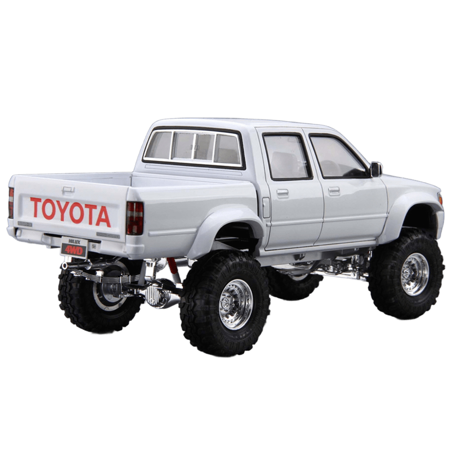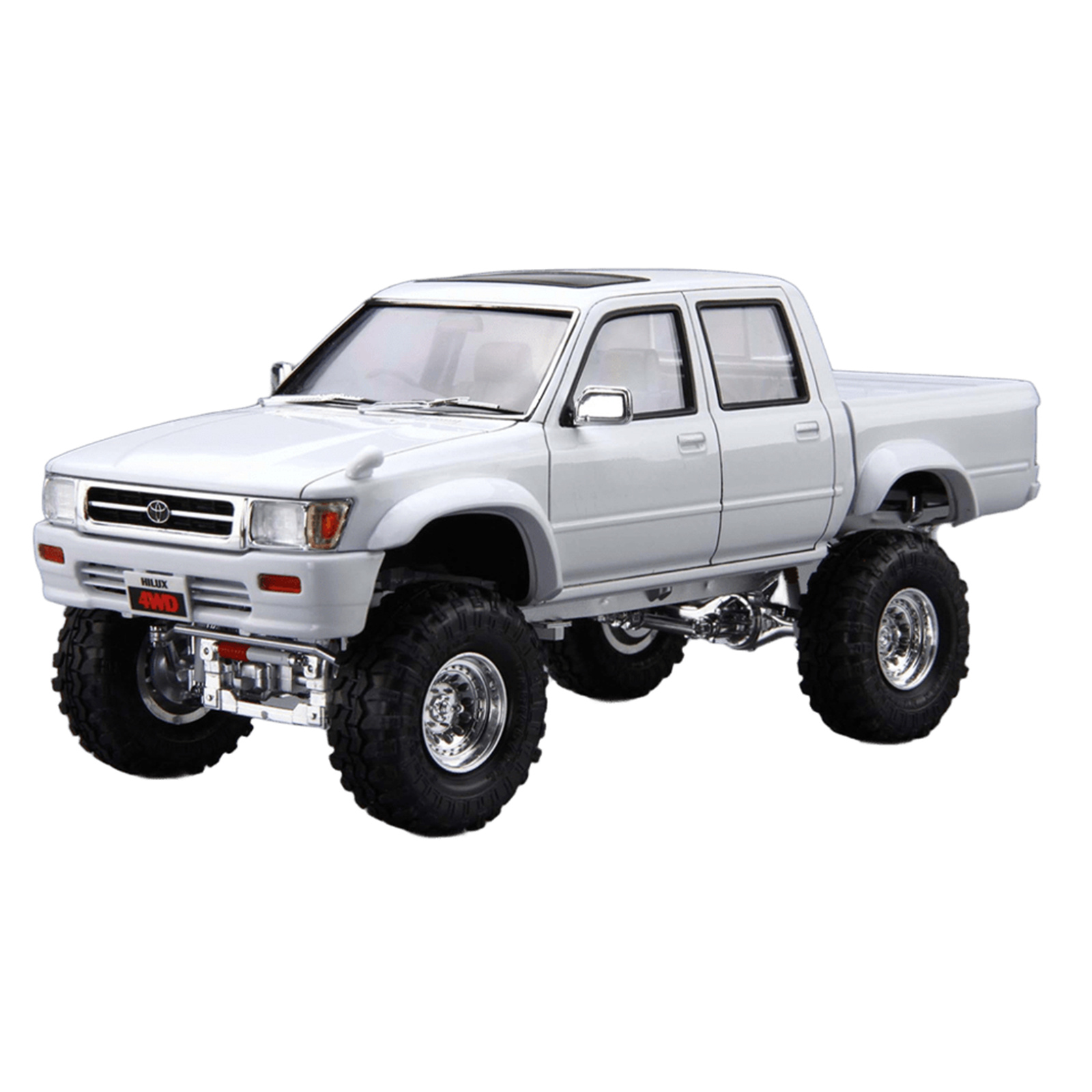This Hilux model captures the 1994 LN107's rugged look with precise lifted chassis, robust tires, chrome-finished parts, and aluminum wheels. Window masking seals and other details make it ideal for hobbyists who enjoy careful assembly and painting.