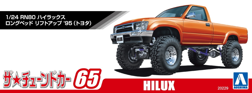 This 1/24 scale model faithfully recreates the 1995 RN80 Hilux Long Bed with a lifted suspension, part of the Tuned Car series. It's designed for enthusiasts who love building classic custom trucks with precise body details and realistic stance.