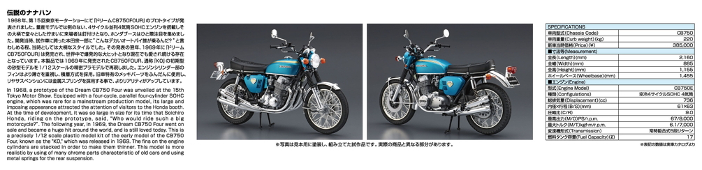 A 1/12 scale precision model of the early "Sandcast model" of the Honda Dream CB750FOUR, or K0 (K Zero), which was released in 1969.
