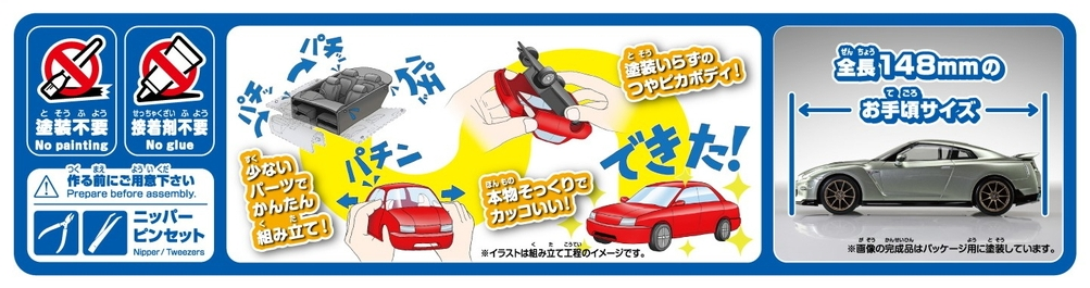 The kit preserves the R35 GT-R's distinctive proportions and sharp body lines, delivering a faithful miniature that clearly reflects the character of the real car despite its small scale.