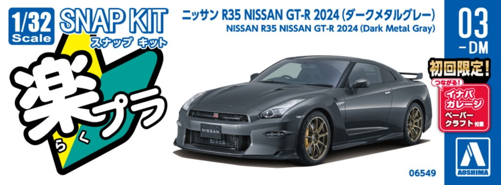 The GT-R R35 is a modern sports car legend. The Aoshima 1/32 snap-fit kit captures the 2024 model in Dark Metal Gray, providing a compact, well-detailed miniature that's easy to assemble.
