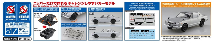 The new scale car series "Snap Car", which Aoshima is proud to present, is designed for those who want to build a plastic model car but don't know how or don't want to make mistakes. No glue is used, no painting is required, and the number of parts has been reduced, greatly lowering the difficulty of building a plastic model. Of course, you can also paint the model in earnest!