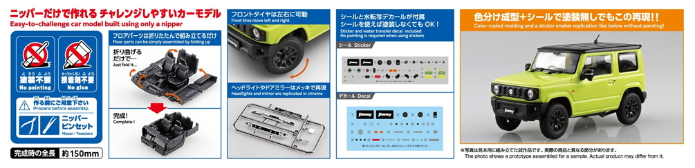 The Aoshima 1/24 kit brings the popular compact off-road SUV to life in a fun and accessible model kit. Designed for beginners and seasoned modellers alike, the Snap Car system makes assembly simple while retaining accurate details, allowing you to enjoy building and displaying a miniature Jimny with ease.