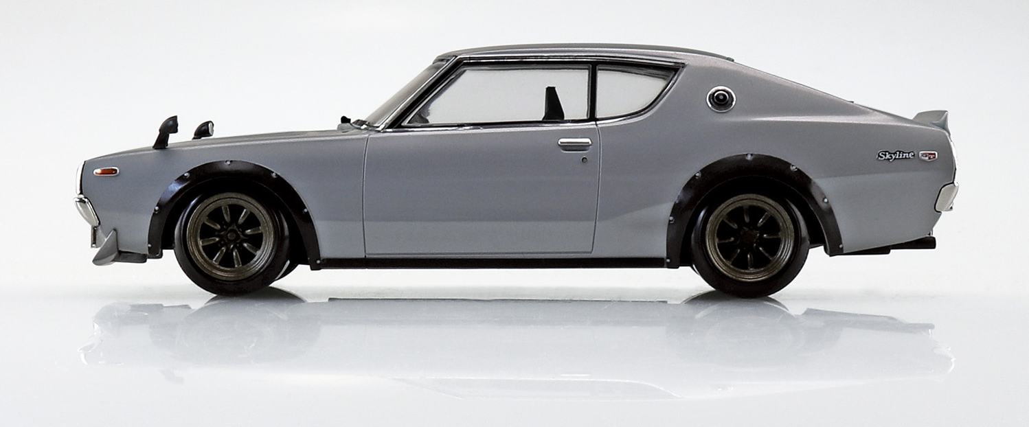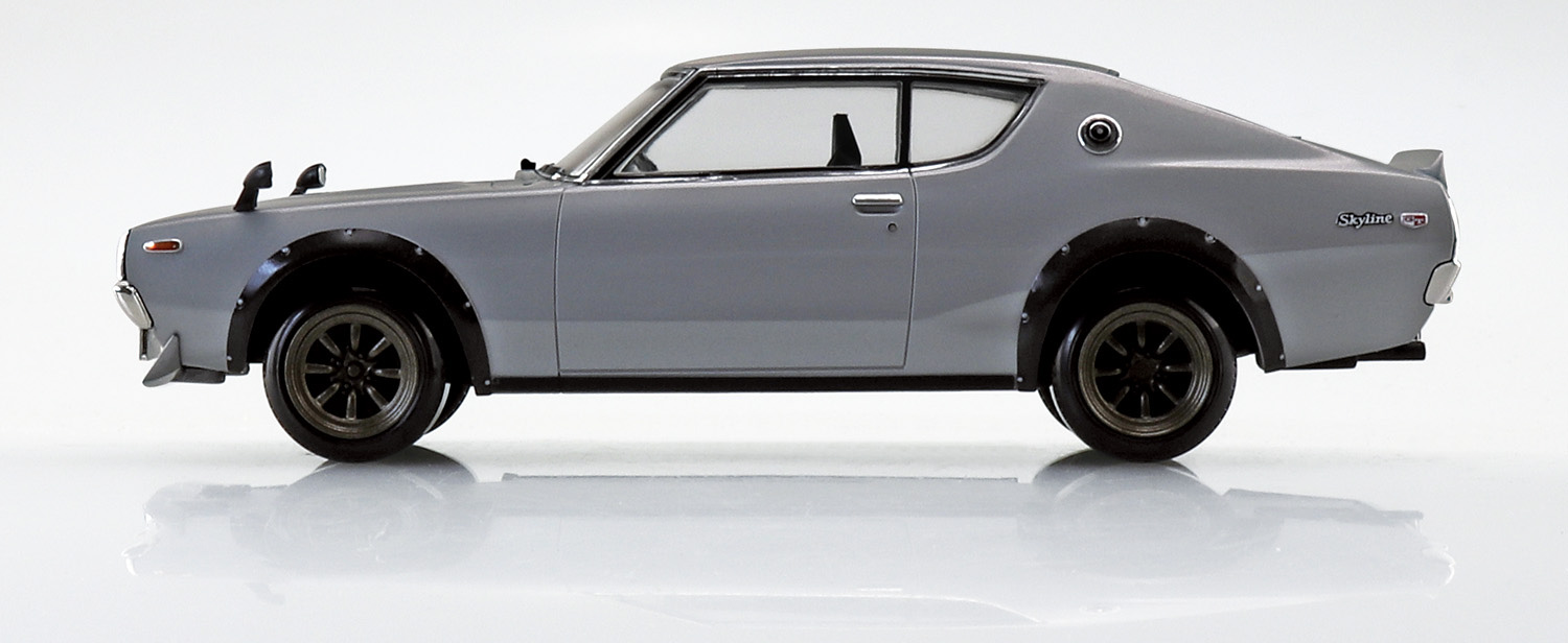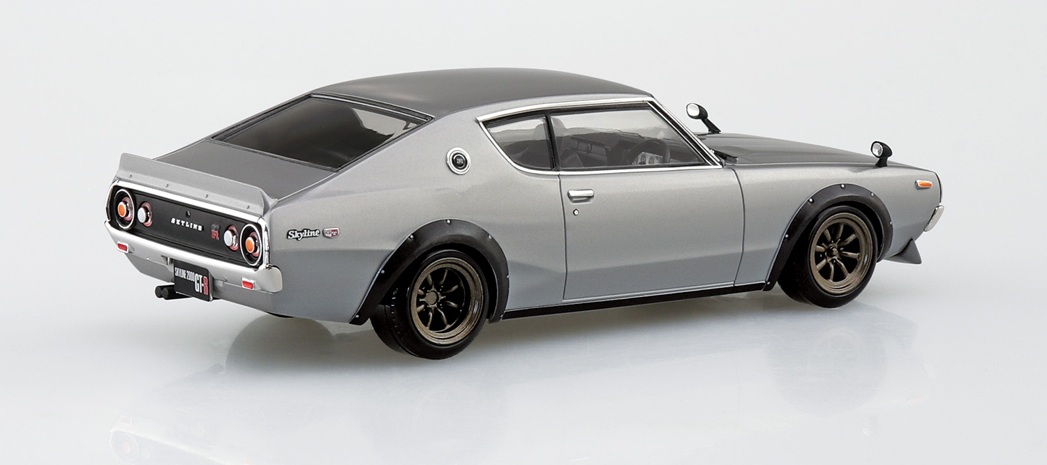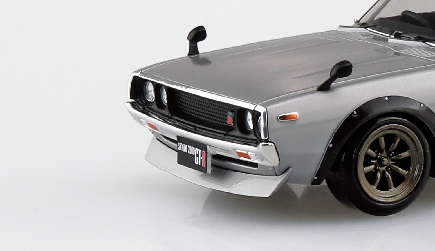 This plastic model kit brings to life the legendary vintage Nissan C110 Skyline GT-R, often affectionately called the "Kenmeri GT-R." The C110 represents one of Nissan's most nostalgic performance cars from the early 1970s, remembered for its bold styling and motorsport heritage. This version focuses on the customized variant - complete with a stylized chin spoiler and unique stance - evoking the spirit of classic Japanese tuner culture.