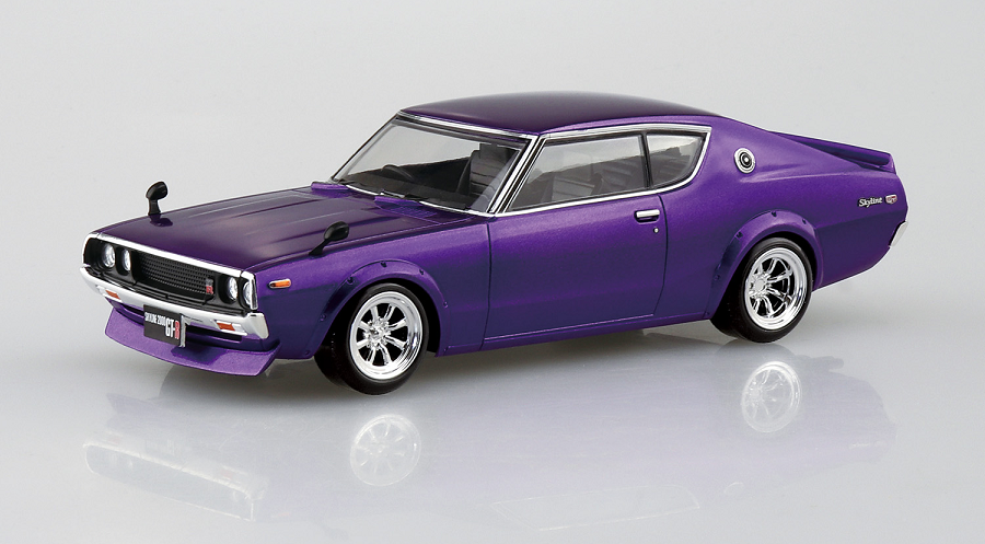 This model celebrates one of the most beloved icons of Japanese automotive history - the Nissan C110 Skyline GT-R, fondly known as the Kenmeri Skyline. Aoshima's rendition captures the classic silhouette and distinctive proportions of the original early 1970s sports car, but here it's given a head-turning metallic purple finish that instantly elevates its presence on display shelves or in collections.