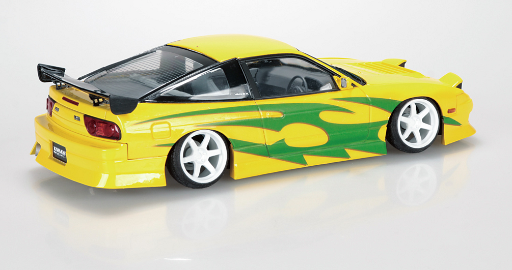 This kit comes loaded with newly engineered parts that faithfully replicate the custom-tuned look of a full aero 180SX. Highlights include a TYPE-4 full aero kit, an aero bonnet with duct (Aerobon), and a 3D wing with low-mount stays - elements that define the aggressive silhouette and aerodynamic focus of this iconic build. Complemented by a new cannonball-style muffler and lowered suspension, the kit captures both visual flair and performance cues.