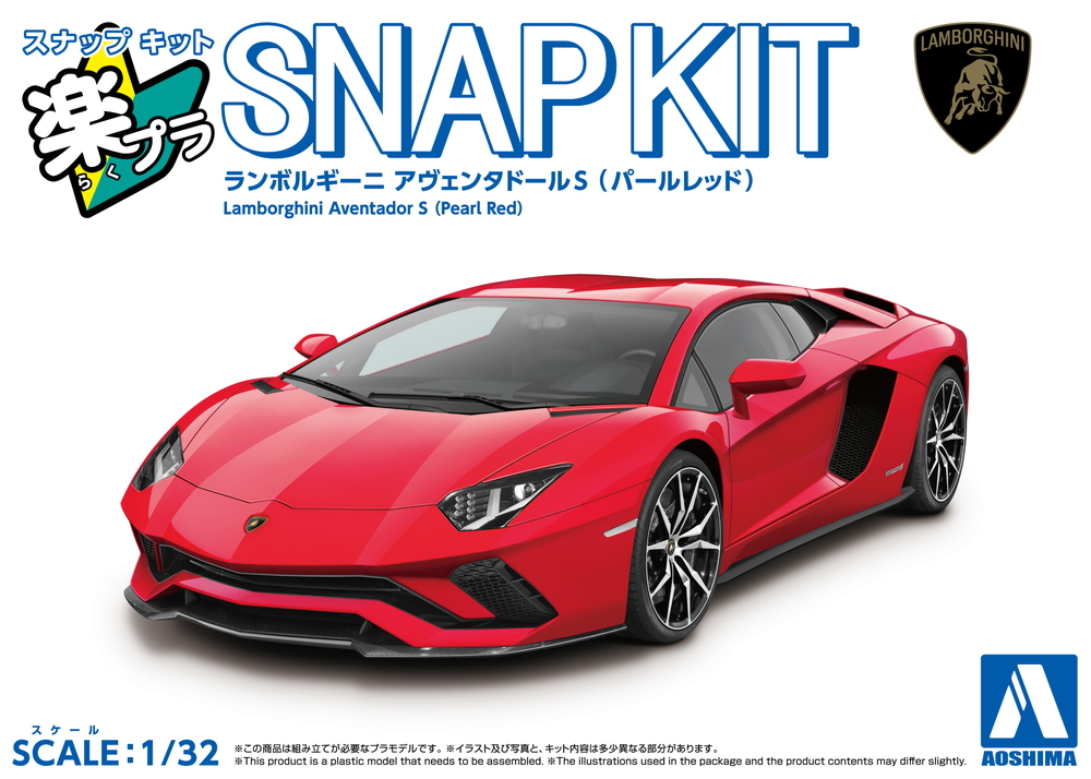 The Aoshima 1/32 Lamborghini Aventador S snap-fit kit reproduces the Aventador's bold silhouette in a vivid Pearl Red. Its easy-to-assemble design lets hobbyists concentrate on display and finishing rather than intricate building.