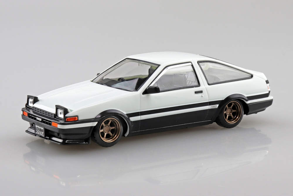 The Aoshima 1/32 Trueno Sprinter High Tech Two Tone snap kit recreates the classic Toyota AE86 Trueno in a compact, display-friendly scale. Featuring the distinctive two-tone finish and sharp 1980s styling, the model is designed for simple assembly while preserving the car's iconic proportions. It is a great choice for collectors and hobbyists who want an easy build with strong shelf appeal.