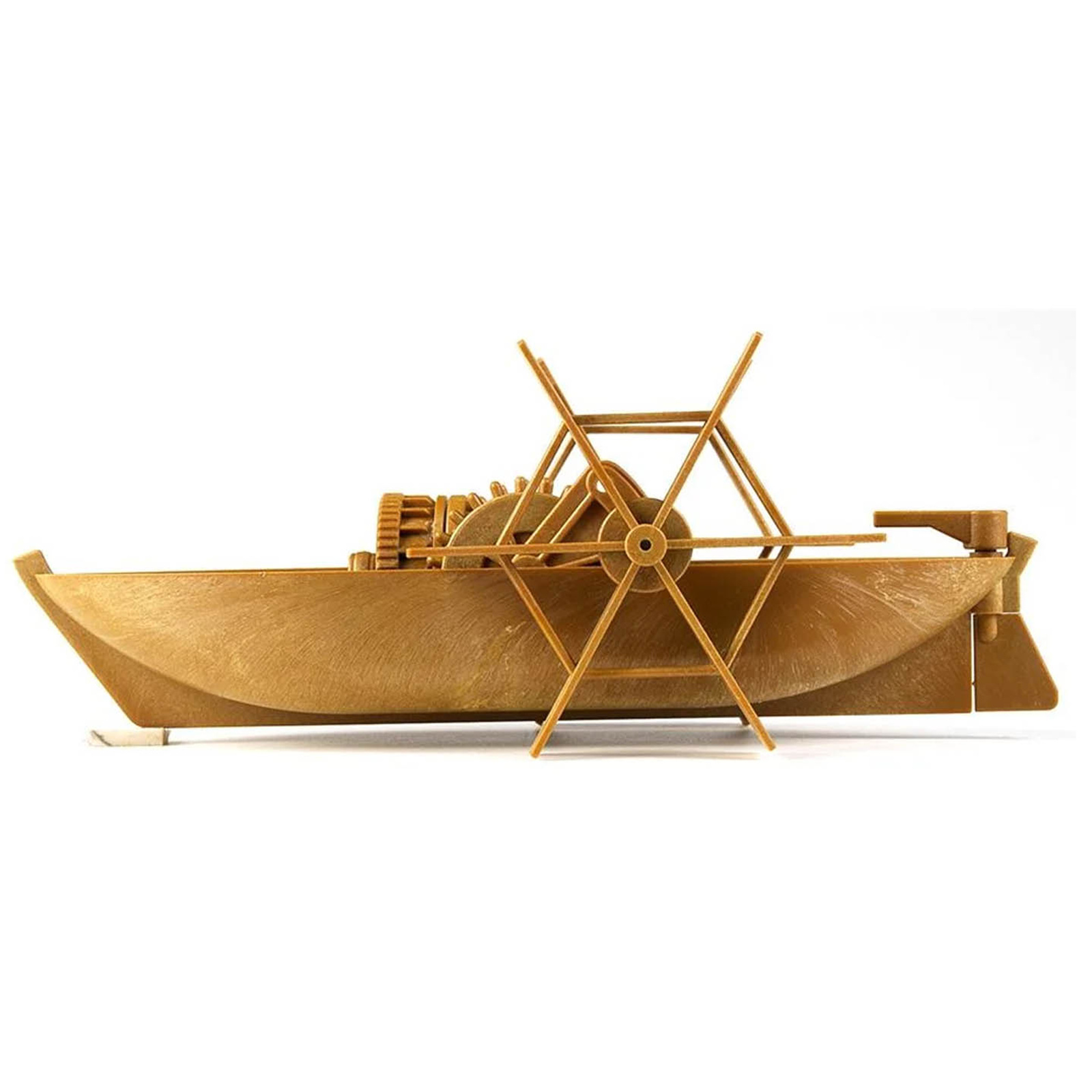 Leonardo da Vinci envisioned propulsion that did not rely on sails or oars, but instead on rotating paddle wheels. This model reflects his forward-thinking design, with gears and sprockets transmitting power to the paddle wheels. The finished model operates with a spring-powered mechanism, showcasing how energy is transferred into motion. It's a fascinating glimpse into Renaissance-era engineering that still inspires modern technology today.