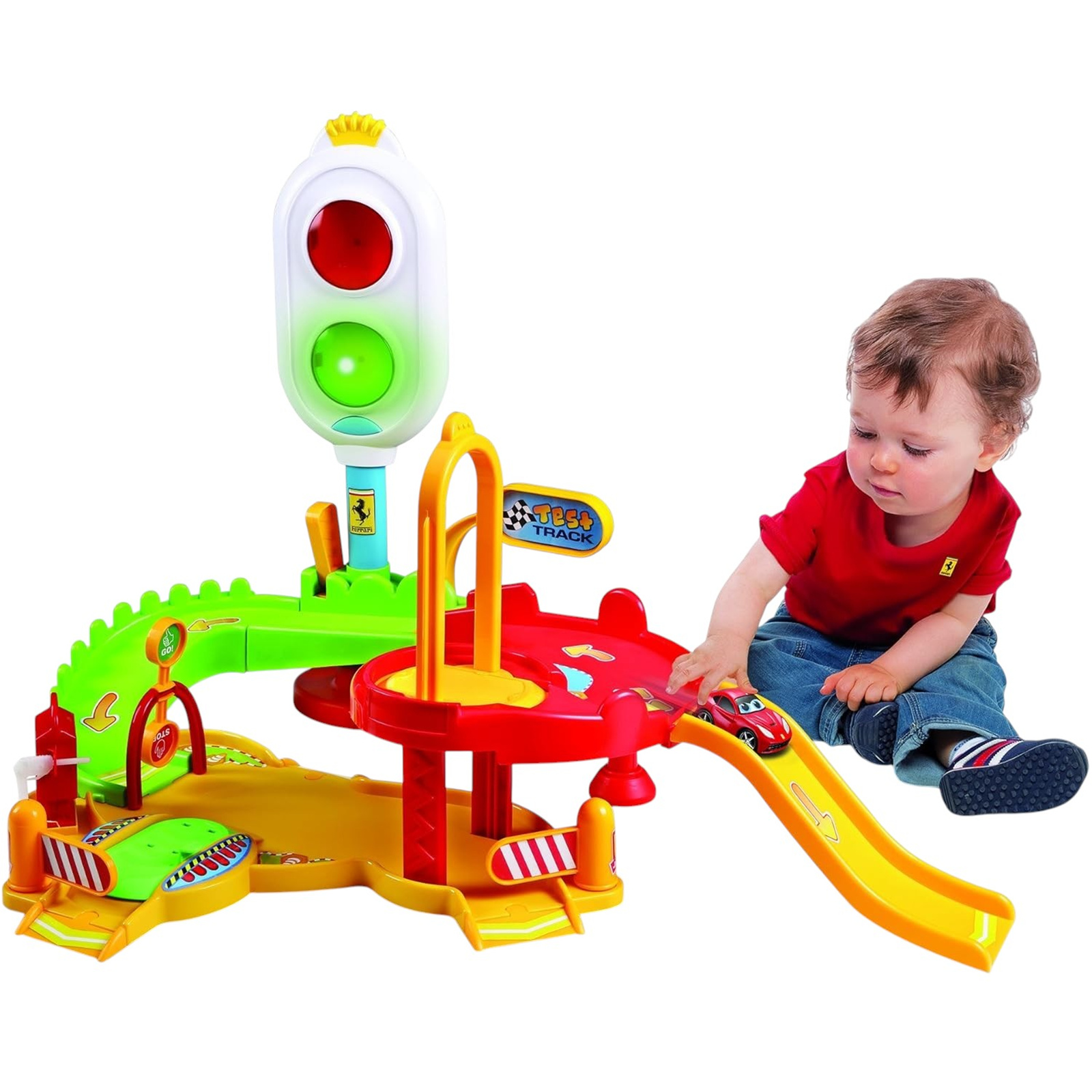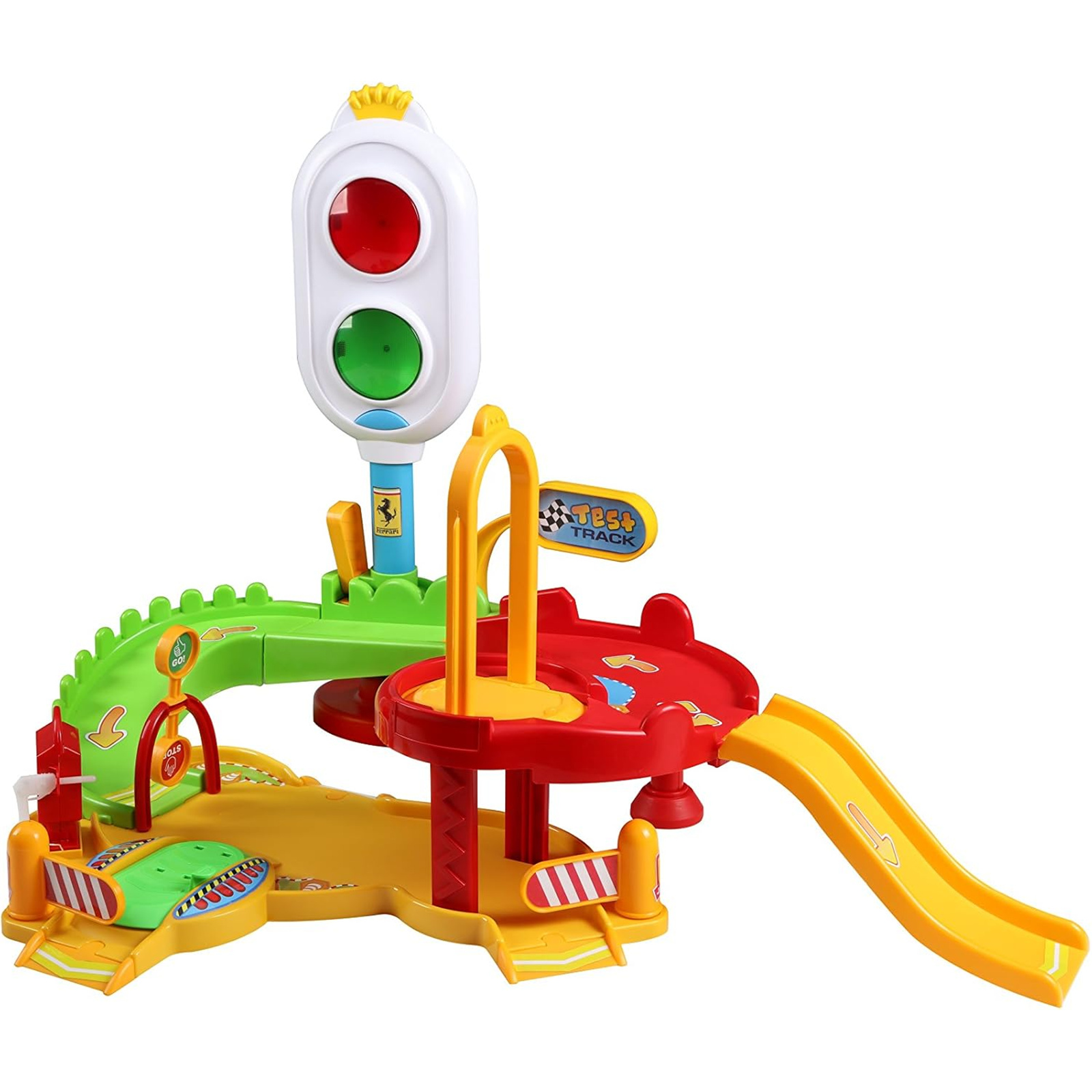 The playset features a stunning free-wheel Ferrari F12 Berlinetta, allowing little racers to zoom around the vibrant track. Kids will be captivated by the colorful traffic light that emits delightful melodies, turning every play session into a lively adventure. The innovative lever produces authentic Ferrari sounds, adding to the immersive experience.