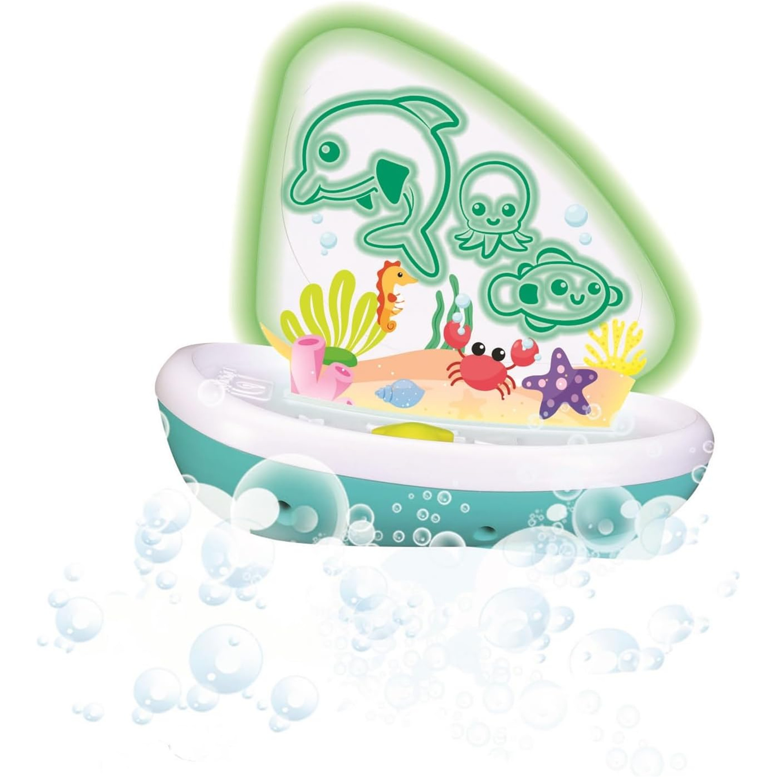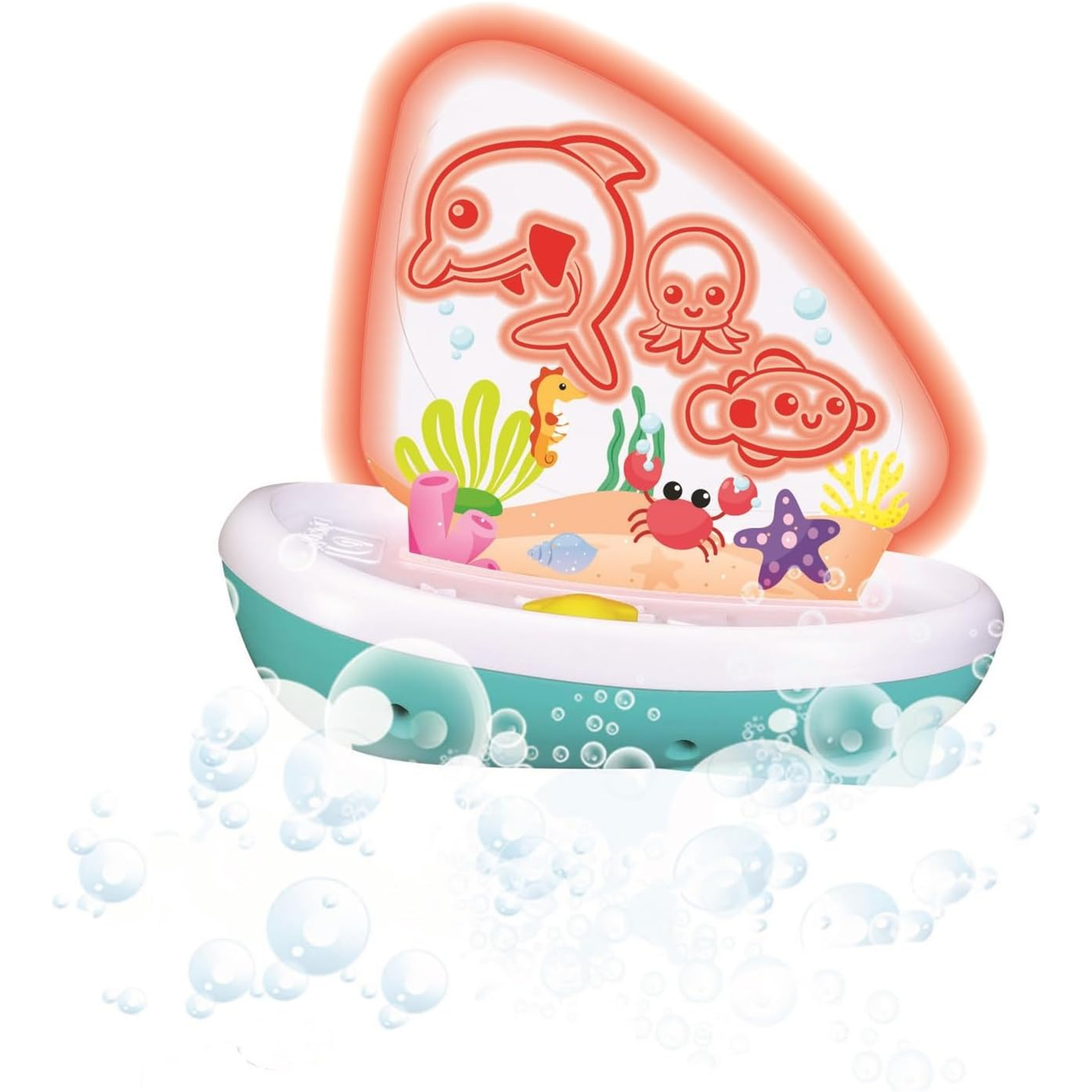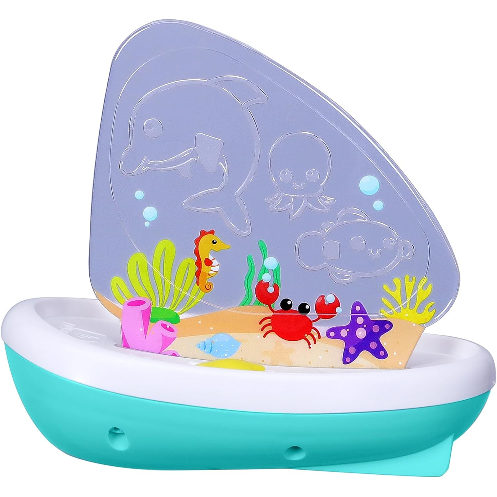 Let your child discover the wonders of light, motion, and creativity with this fantastic bath toy. Press the button to illuminate the clear sail, and watch as cute and playful sea creatures light up while floating in the tub or pool.