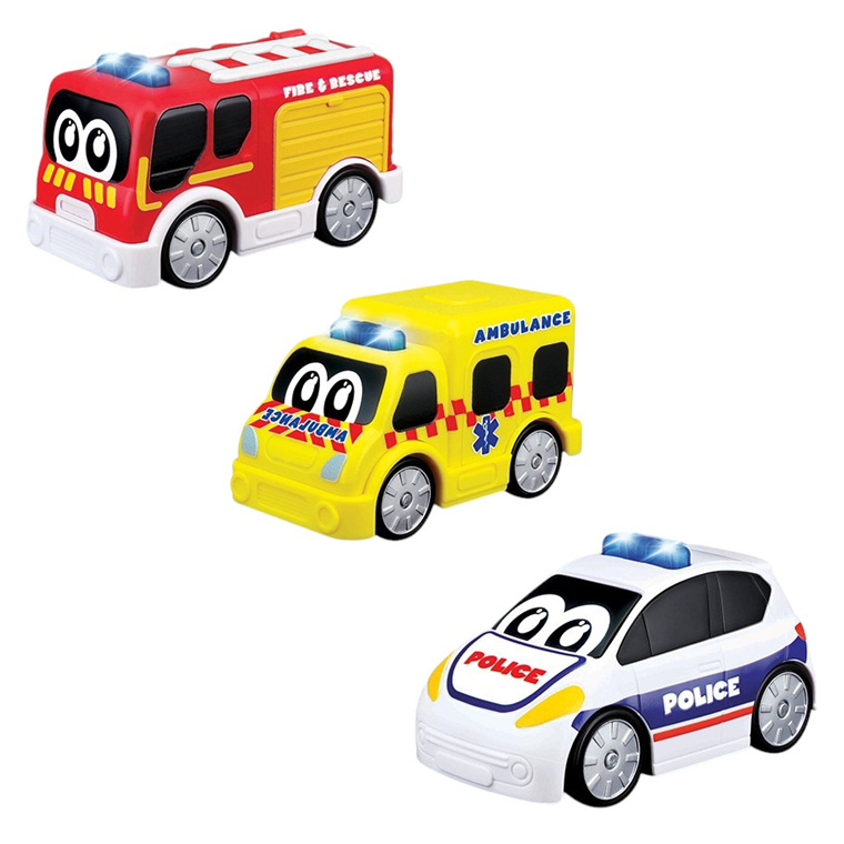 Set Includes: 3 emergency vehicles - Fire Truck, Police Car, and Ambulance