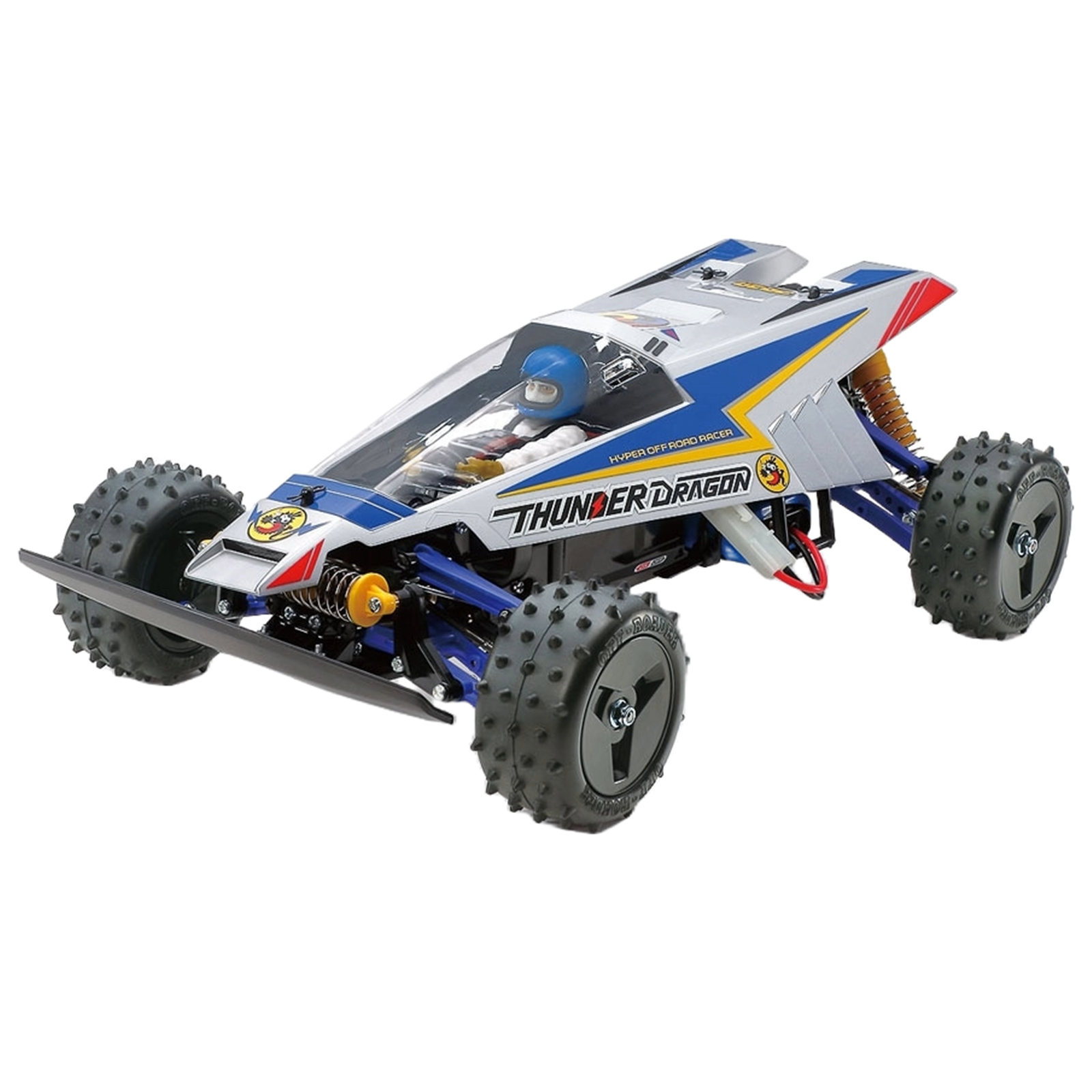 This assembly kit creates an updated re-release version of the classic R/C off-road buggy Thunder Dragon, which appeared in a Japanese cartoon in the 1980s. Its ABS bathtub frame is tough and allows easy maintenance, while 4-wheel double wishbone suspension uses CVA oil dampers and a front stabilizer for a superior ride. Sealed gearboxes front and rear contain differentials with die-cast 3-bevel types for smooth, superior handling feel, and semi-pneumatic spike tires give great grip. The streamlined body is molded in polycarbonate, with non-canopy sections painted in silver. It is pre-cut for convenience.