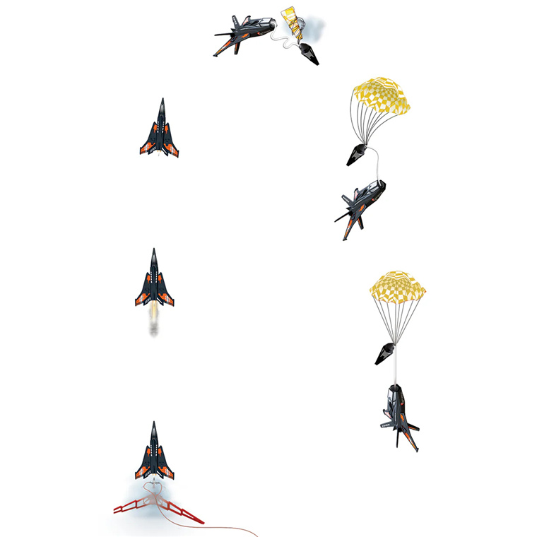 - The model rocket launches upright using a standard Estes launch pad and launch controller (included).