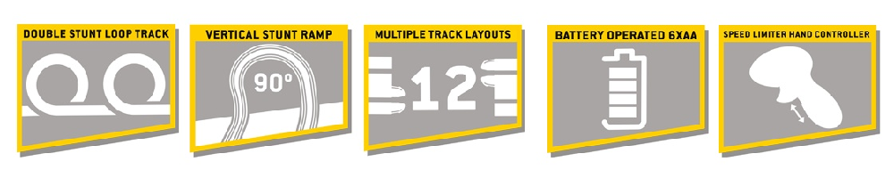 Featuring 5.7 meters of track with two loop-the loops and a half pipe which can create 12 unique layouts.
