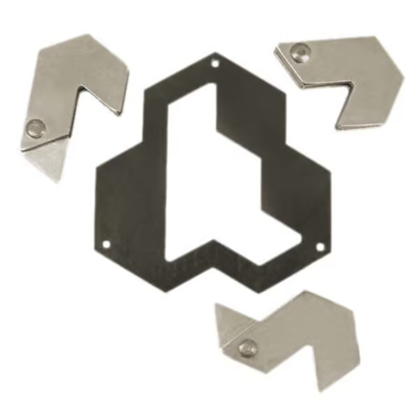 800A puzzle made up of a collection of hexagon shaped pieces. It is made up of an inside with three pieces and an outside frame. One slides them around inside the frame and rotates them to try to get them out of the frame. At a glance the pieces appear to have the same shape but the exterior and interior are different, ending up with three pieces whose shapes are different.
