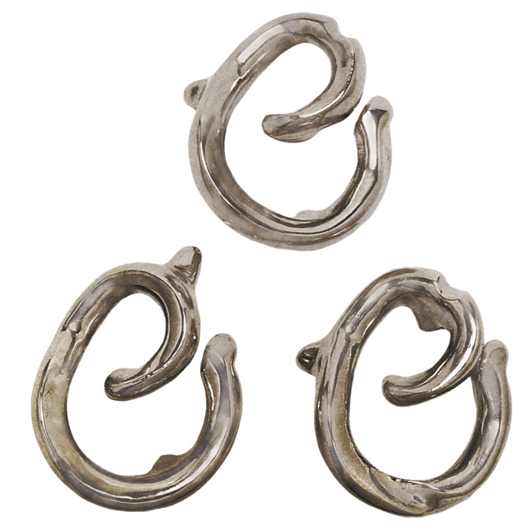 - Features three interlocked metal pieces with spiral (vortex) shapes and two protrusions each