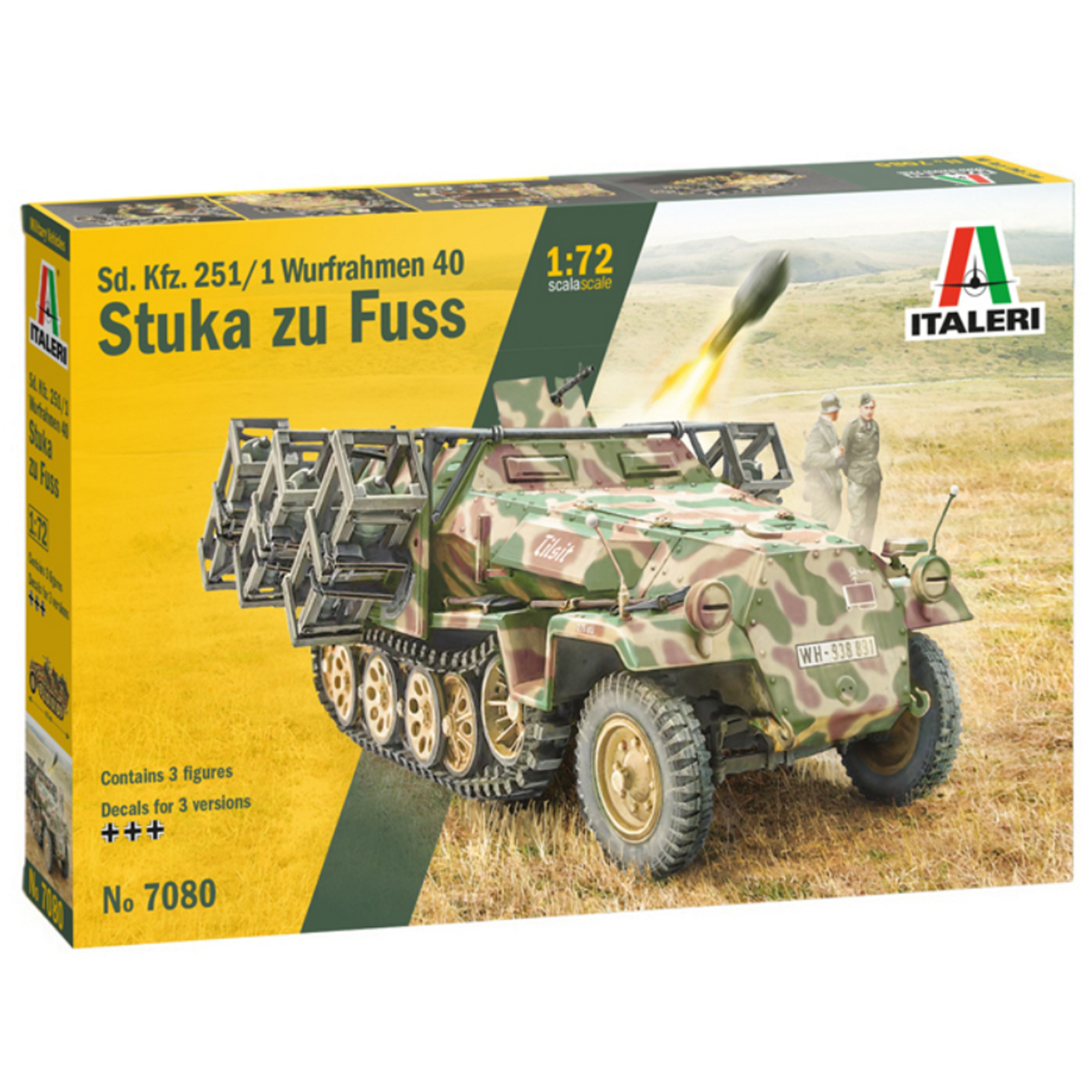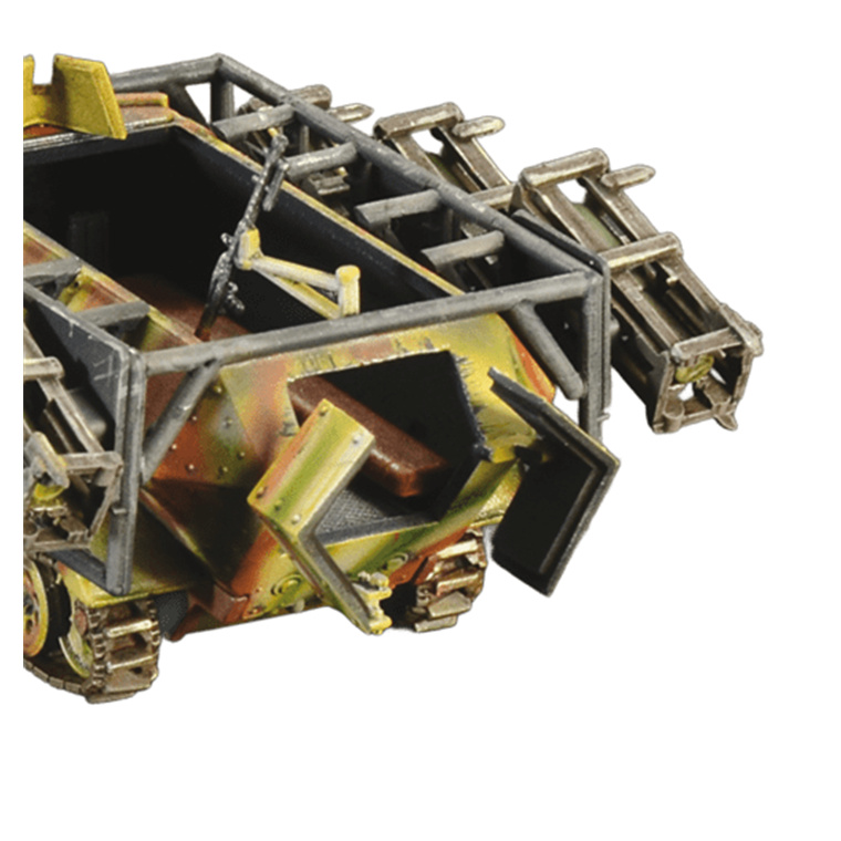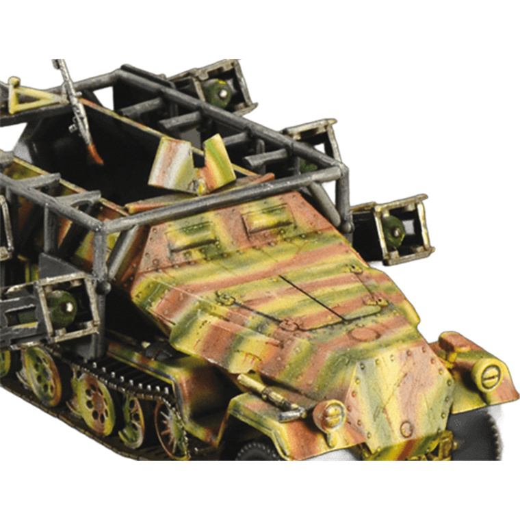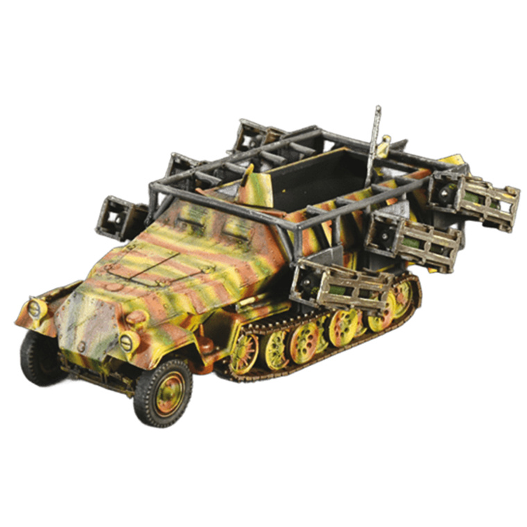 The Sd.Kfz.251 half-track was an armored fighting vehicle (AFV), which was deployed by the Wehrmacht on all operational fronts during the Second World War. Powered by a Maybach 6-cylinder petrol engine it was able to reach a speed of 55 km / h even on 'off road' terrain. Produced in huge numbers, it was mainly used to transport 'Panzergrenadiers', but during the war several versions were developed to meet differing operational requirements. The Wurfrahmen rocket launcher version was built on the Sd.Kfz.251. Equipped with 6 compartments, 3 on each side, intended for the launch of rockets of different sizes, it was nicknamed "Stuka zu Fuss". Although not precise, it could have an important psychological effect on enemy troops and still proved to be a valid support for ground troops especially in urban fighting.