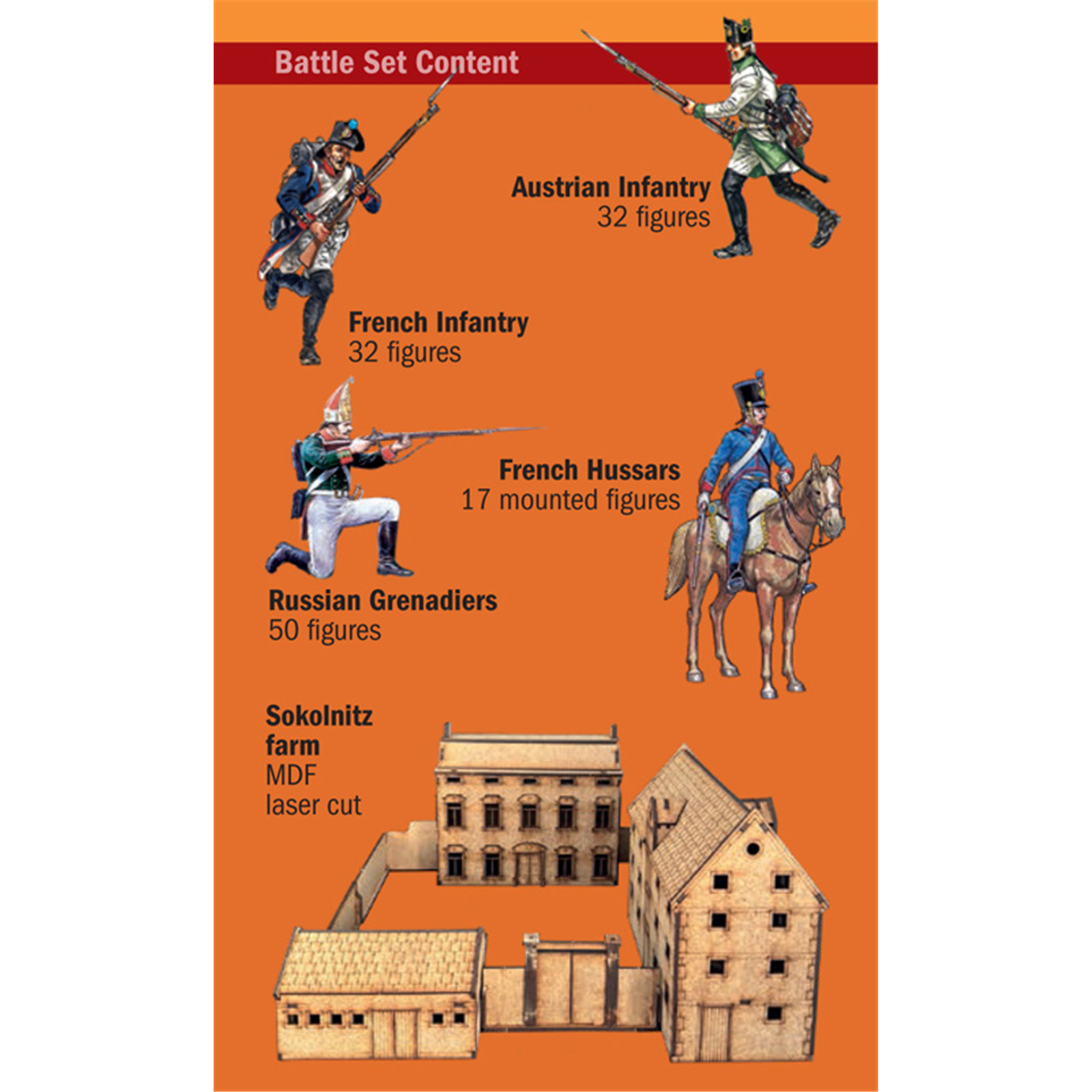 The set includes a carefully selected mix of French and Allied infantry figures, allowing builders to recreate the fierce struggle between Napoleon's Grande Armée and the Russian and Austrian forces contesting control of the village.