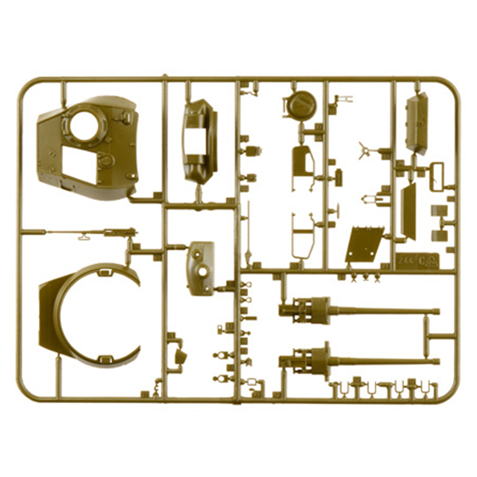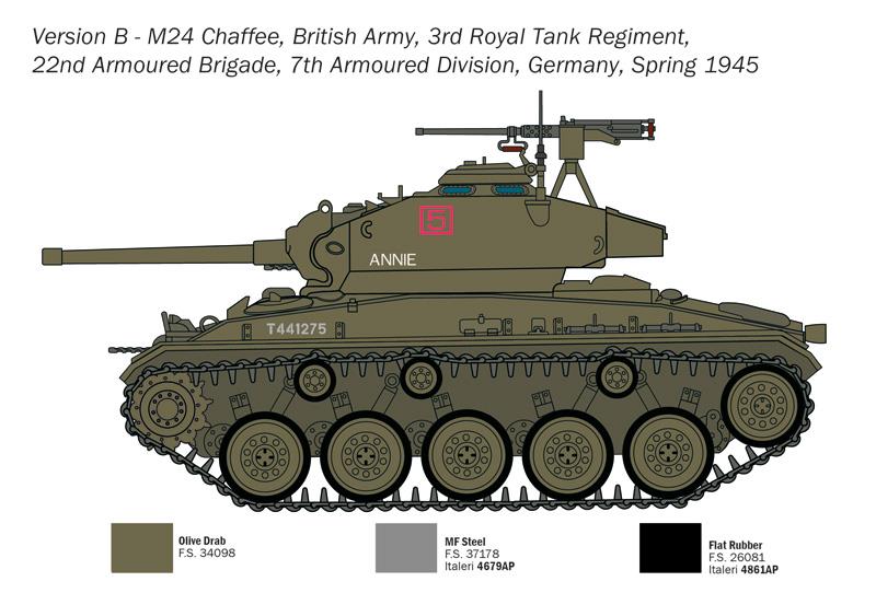 The M24 Chaffee tank was distributed to American Army units starting in 1944 to provide a lightweight tank on the battlefield capable of replacing the outdated M3/M5 Stuart. The M24's configuration was significantly different from its predecessor, and its design proved to be highly effective, to the point that it is considered one of the best light tanks ever built. Agile, robust, and reliable, it was well-armed for a "Light Tank," featuring an M6 75mm cannon with 48 rounds available. The tank's armament was complemented by two 12.7mm Browning machine guns. It was also effectively employed in close infantry support missions and advanced reconnaissance operations. During the conflict, effective cooperation was developed between M24 units and more heavily armed armored vehicles, such as the Sherman in its various versions.
