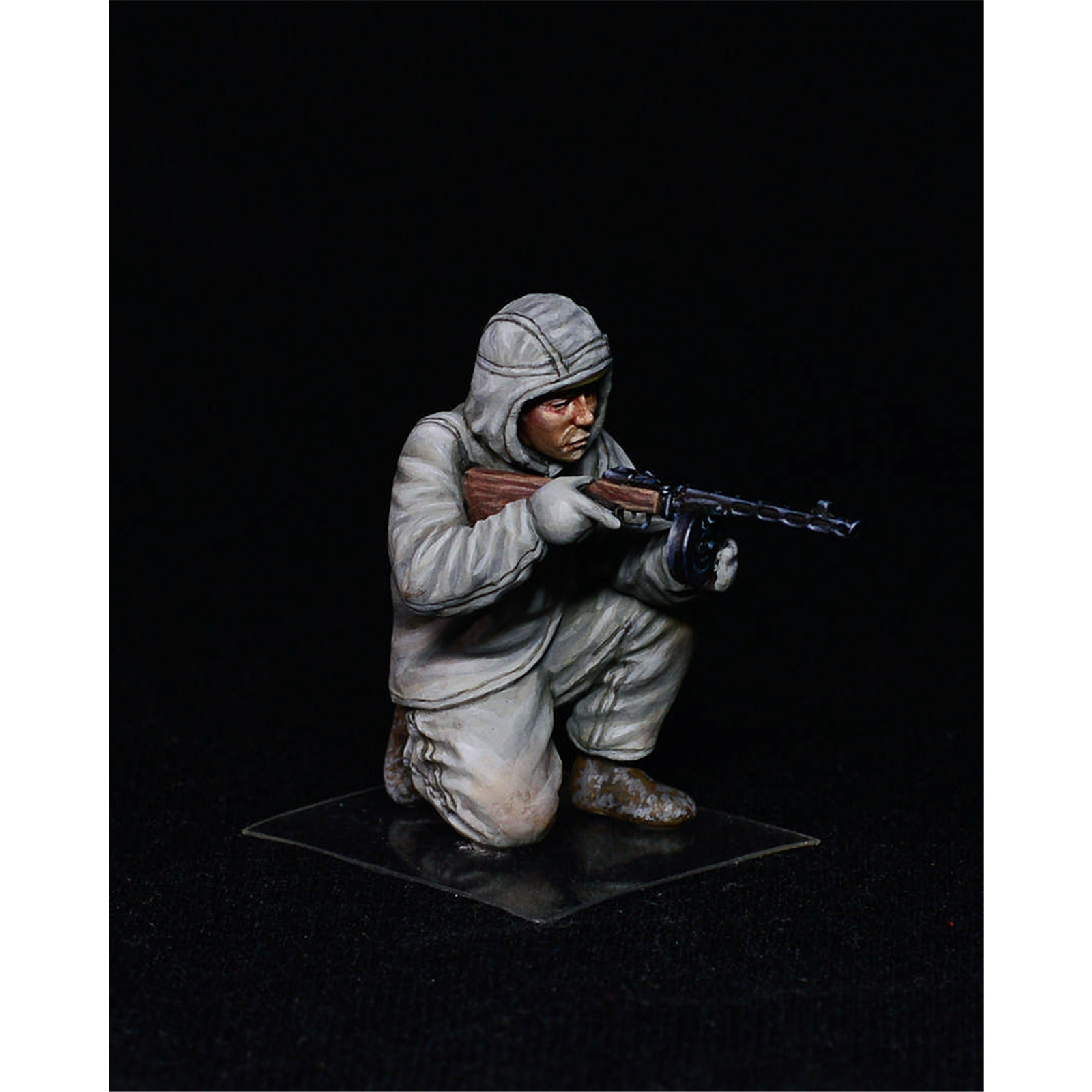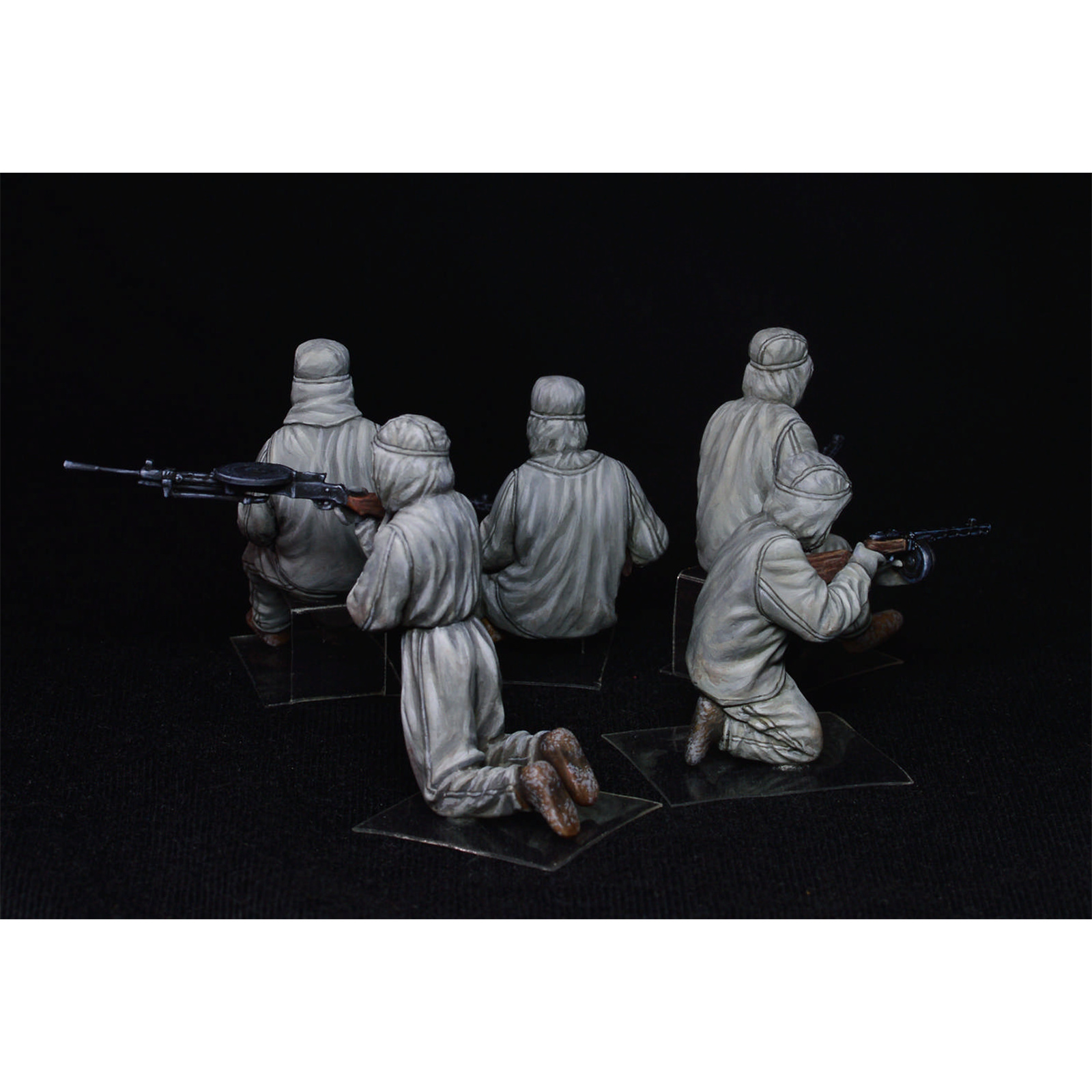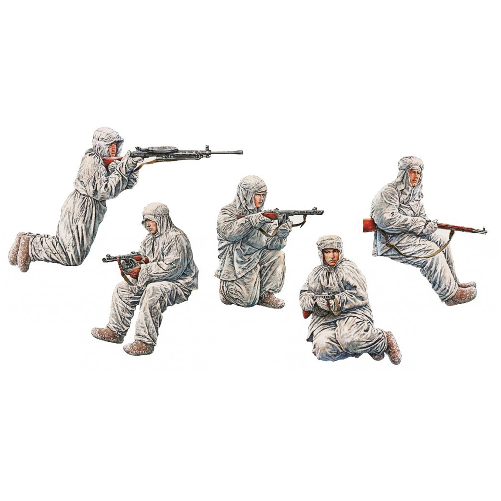 The kit contains 5 uncolored unpainted plastic models of the Soviet Assault Infantry in Winter Masking Robes