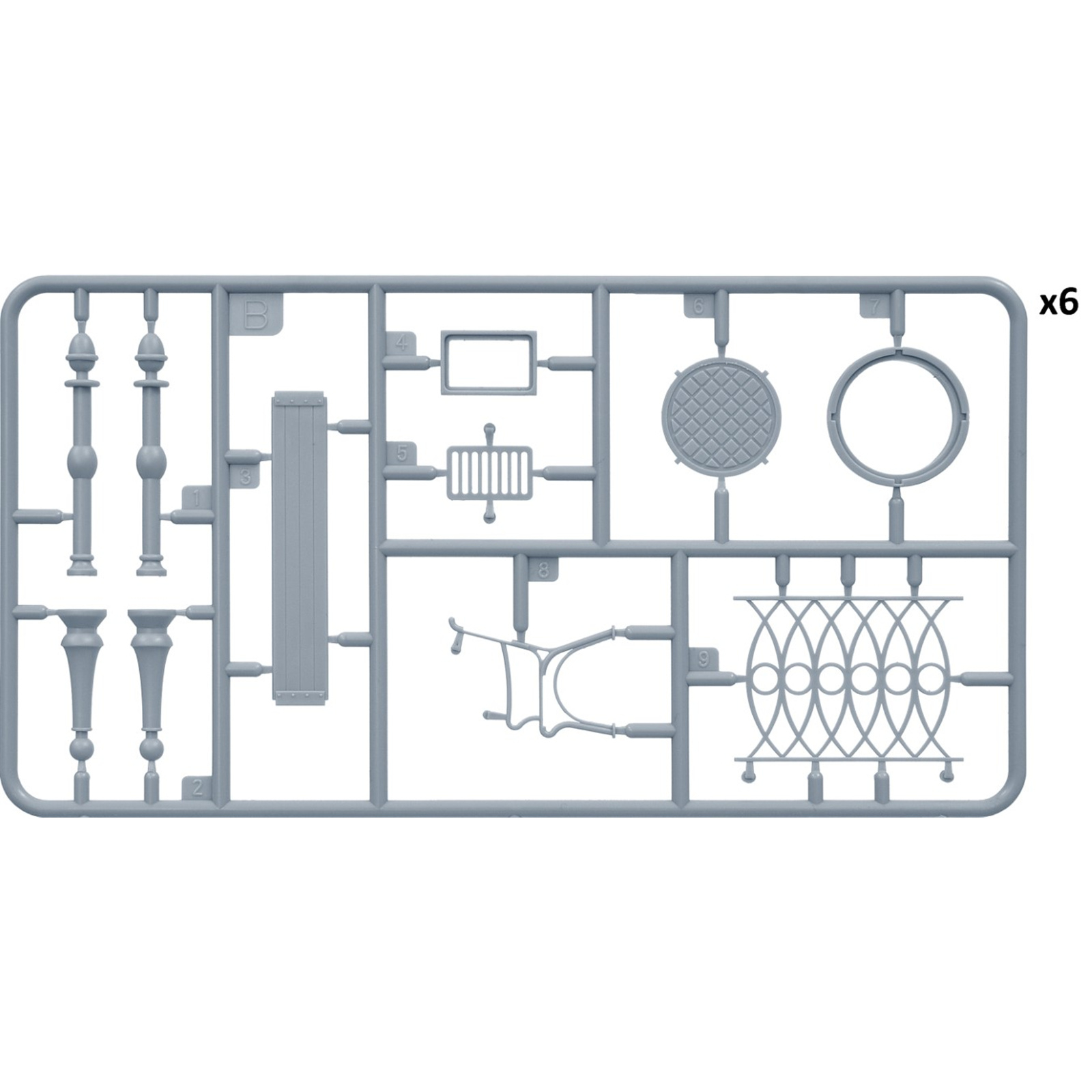 - Kit contains models of: metal fence, benches,Drain hatches, road columns, street lamps & clocks