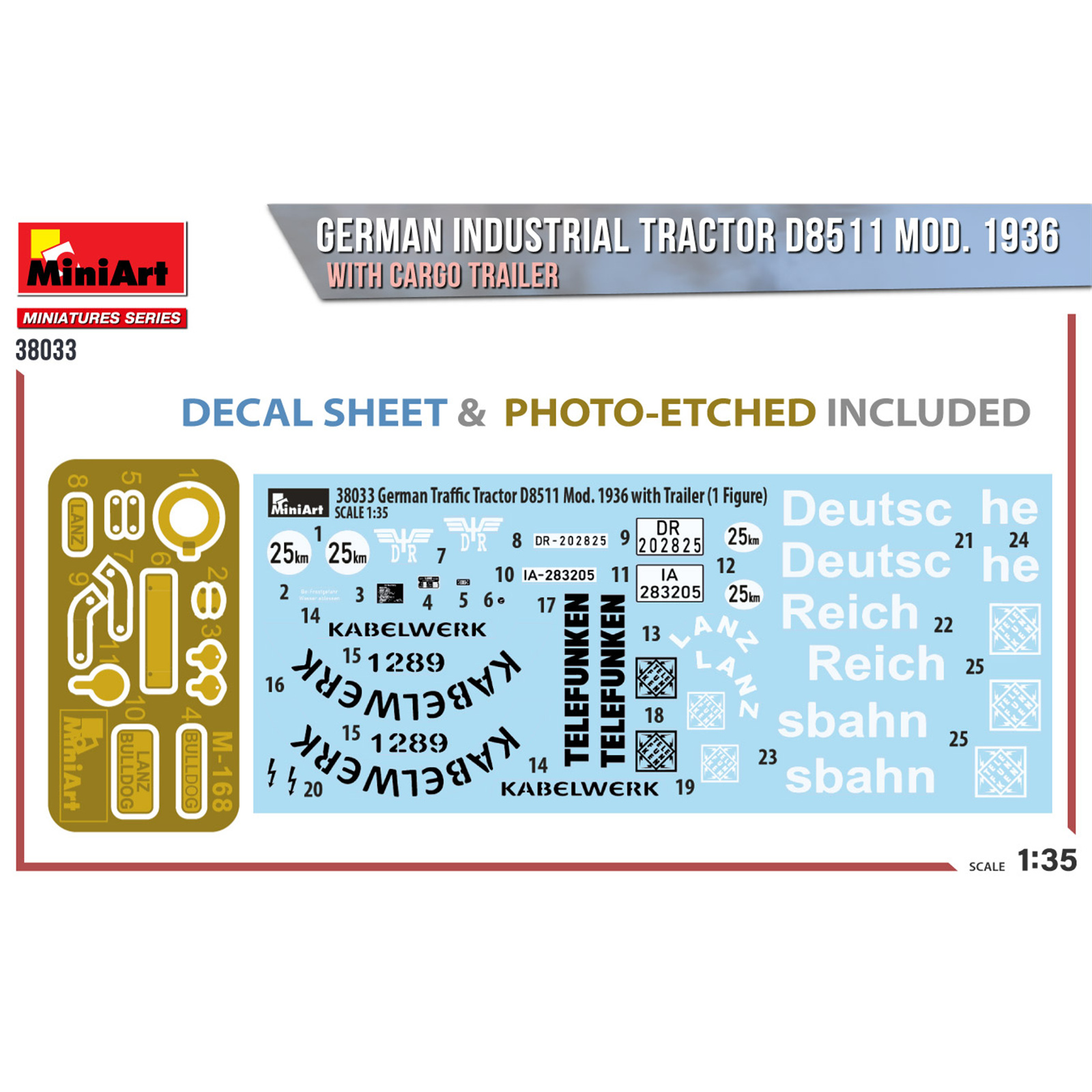 The MiniArt 2-38033 German Tractor with Trailer is an exquisitely detailed scale model kit designed for 1/35 scale modeling enthusiasts. This set captures the utilitarian essence of German agricultural and military tractors used during the World War II era, reflecting both the functional design and rugged construction of the original vehicles.