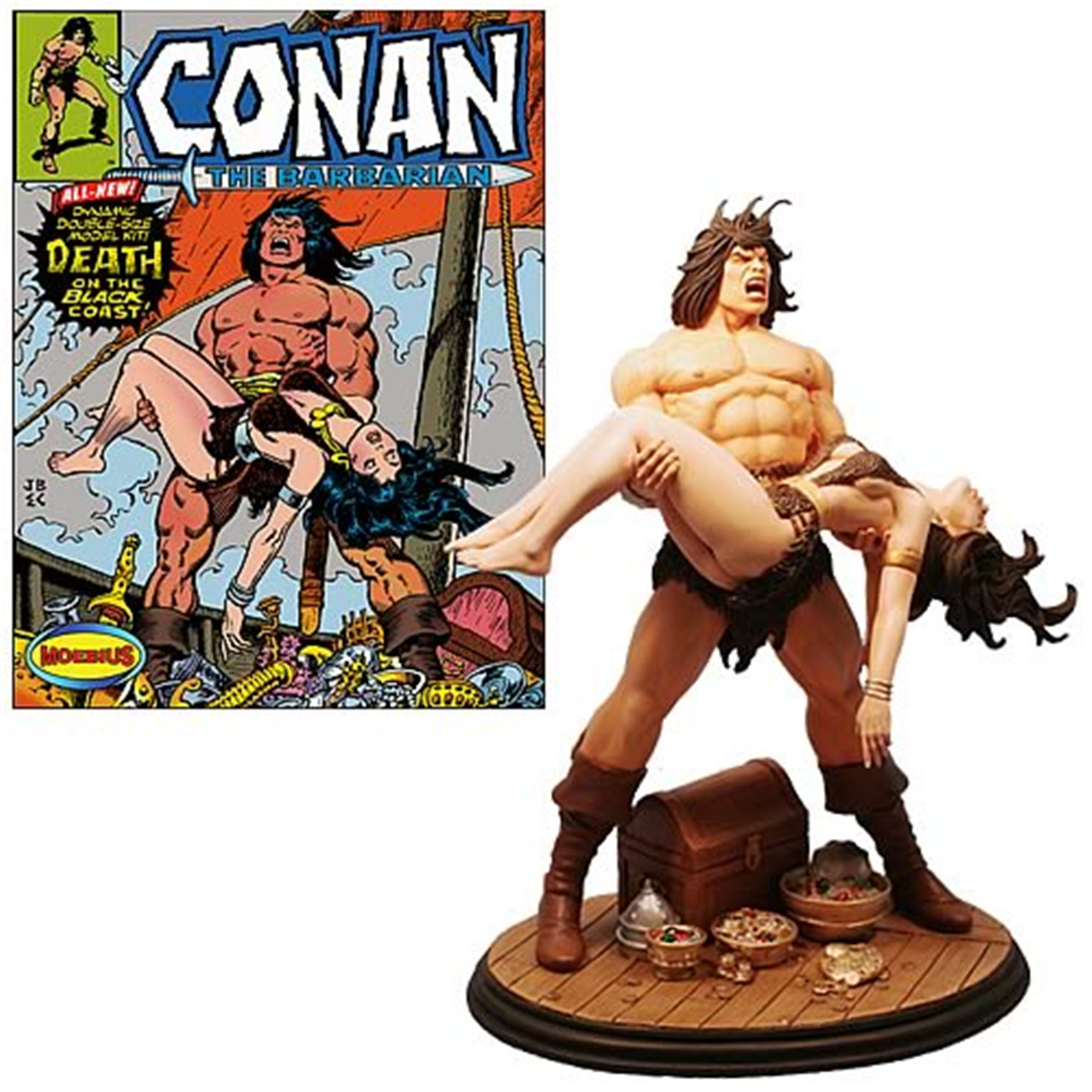Resin kit. From the cover to Marvel Comics' Conan the Barbarian #100 comes this 14" tall model kit, The Death of Belit. This kit depicts Robert E. Howard's immortal barbarian character, Conan, holding his beloved dead pirate queen, Belit, in his arms. Some assembly and painting required. Includes Conan and Belit figures and detailed base and accessories. Completed model measures approx. 14" tall.