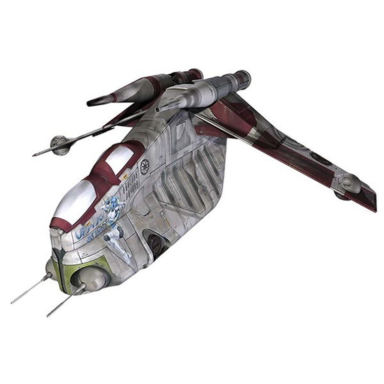 Quick snap together assembly no gluing required. No painting - multicolored painted parts Six clone soldier figures, opening fuselage panels, movable laser cannons and display stand.