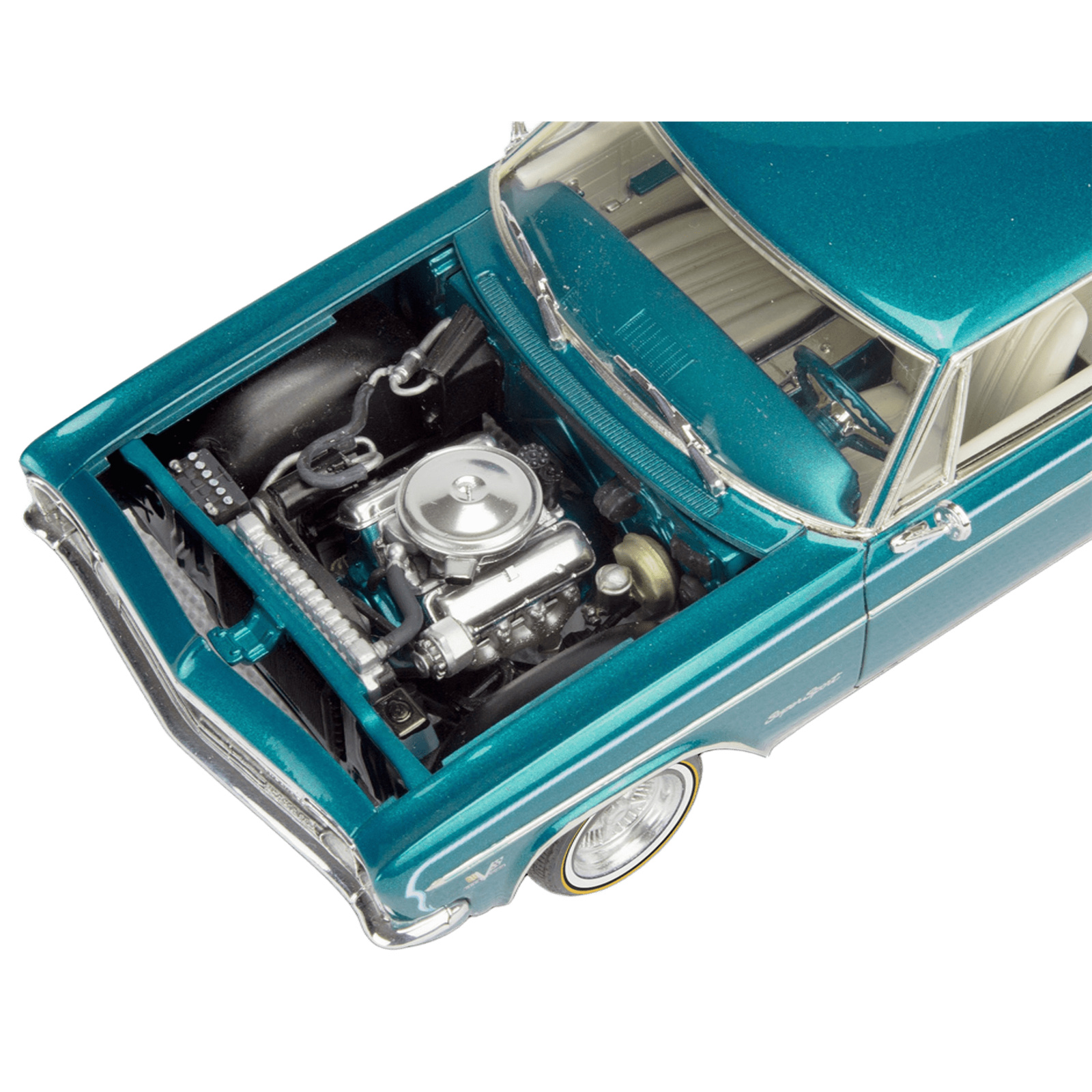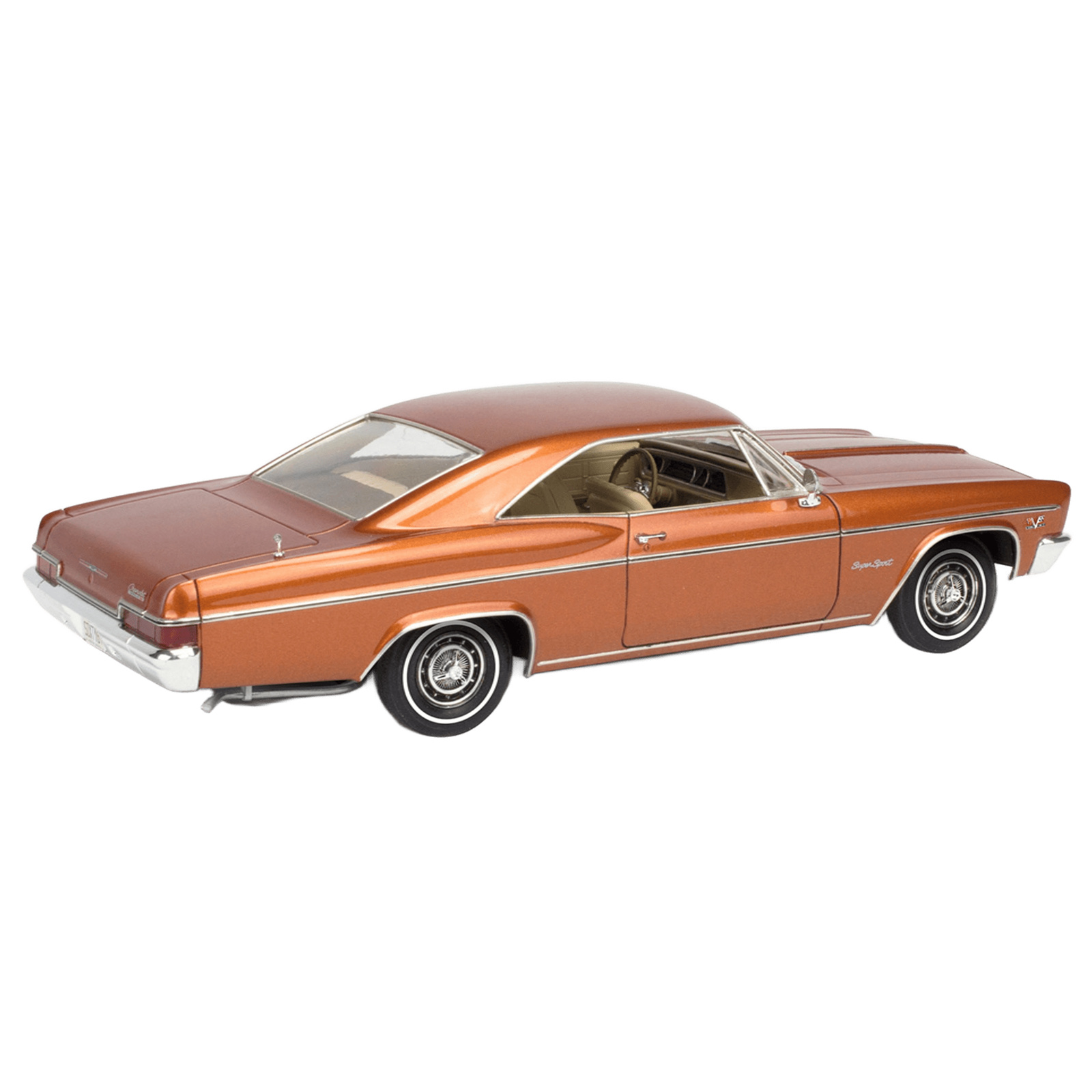 The 1966 Impala Super Sport was the flagship of the Chevrolet® line and the emphasis was on performance and looks. Today, the timeless design of the '66 Chevy® Impala SS is just as striking as it was on the day the first model rolled off the production line. That's why many Chevy enthusiasts dedicate endless amounts of time, energy, and money to restoring, customizing, and collecting these milestone vehicles. - Highly detailed Turbo-Jet 396 V-8 with standard four-speed gearbox - Interior with front bucket seats and center console and complete wheel covers with spinners - Optional stock or lowering for the "low-down" look - Stock wheels with whitewall tires, special low-profile tires with chrome-plated wire wheels - Decals with original factory and custom graphics