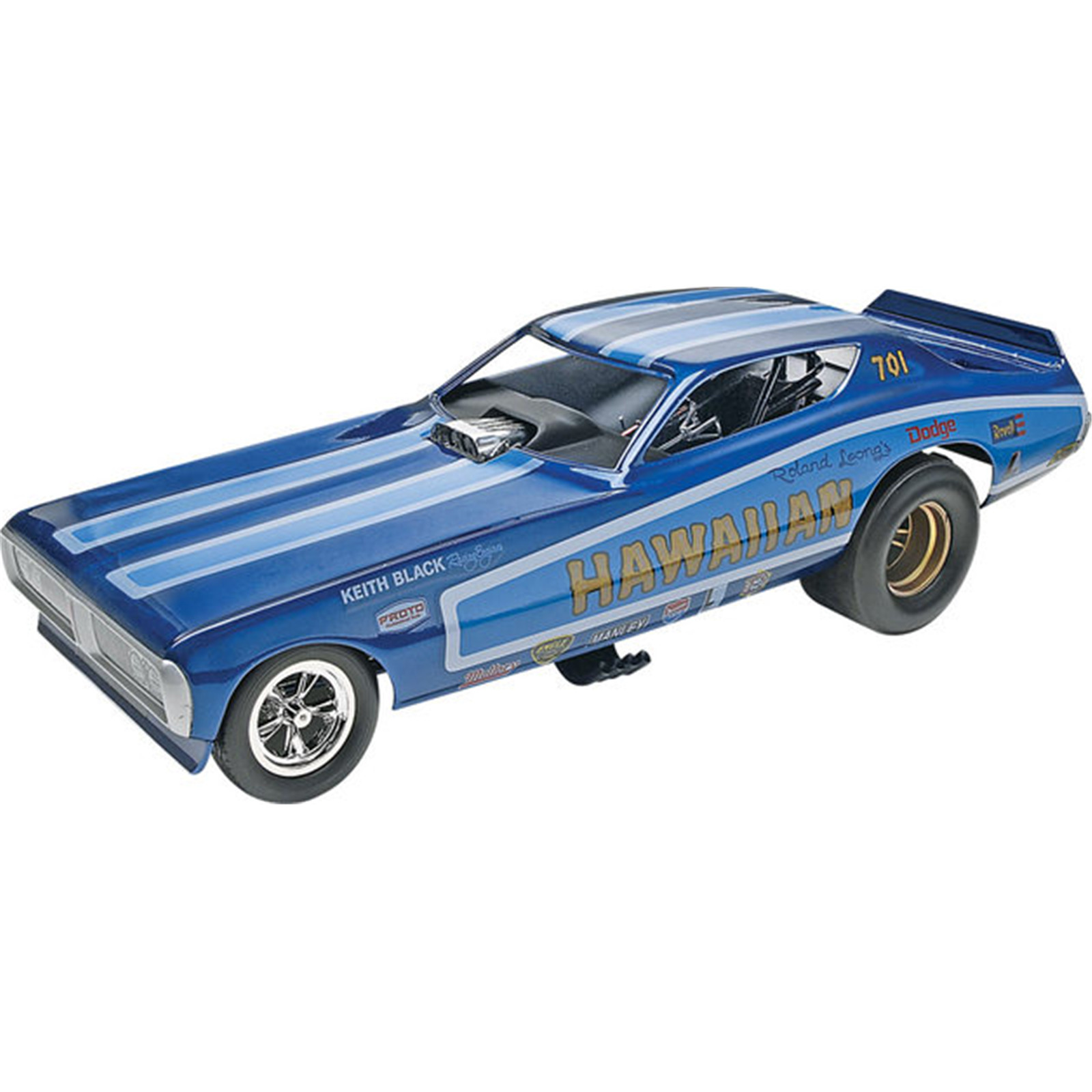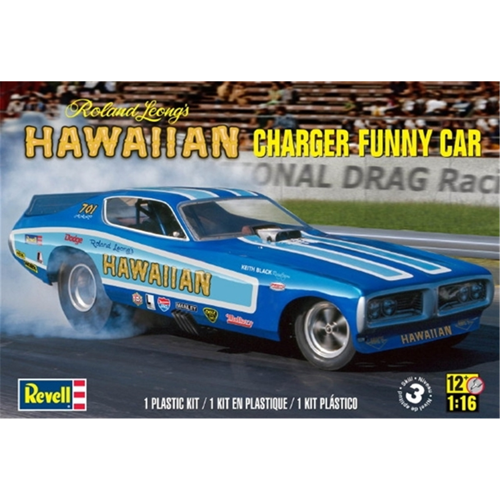 Roland Leong owned and maintained a stable of these vehicles. With a succession of top drivers, his vehicles won drag races all over the country. With so many legendary wins, Revell had to have a model of the Hawaiian Charger Funny Car. These kits took the modelling world by storm in a wave that rivalled the real car's success. Now, this top model is ready for the space you've been saving in your favourite display case! Kit features lift-up body, detailed drag racing engine and real vinyl tubing for fuel lines.