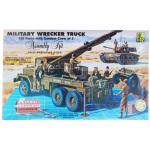 The military wrecker truck is an indispensable piece of equipment. It is built on a six-wheel drive, 5-ton truck chassis. Its complex hydraulic crane system has 360 rotation and is powered by the main engine. At each corner of the truck bed there are screw jacks designed to counter-balance the loads. The maximum capacity of the crane with the jacks down is 20,000 pounds. The truck also has a worm-geared winch at the back with a pulling capacity of 45,000 pounds. The controls are mounted on the body directly behind the winch.