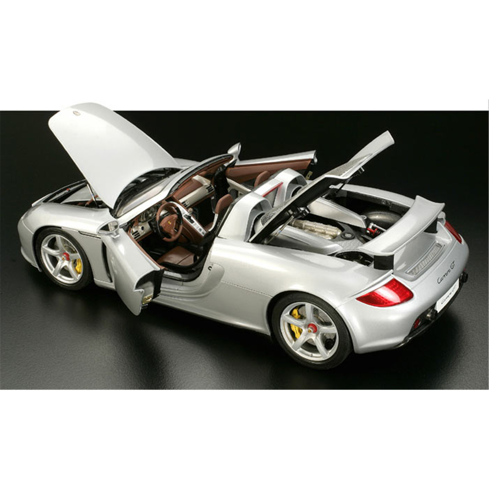 1/12 scale semi-assembled display model of Porsche's flagship super sports car, the Carrera GT. This premium replica is made from a variety of high quality parts, including ABS resin cowling, metallic mesh grille, synthetic rubber tires and die-cast metal parts. Assembly of the delicately curved body follows that of the full-size car, with a beautiful paint job adding the perfect finishing touch. Durable die-cast suspension arms combine with working dampers and stabilizers for real-action suspension. Metal hinged doors, hood and rear cowl open realistically to display fully detailed interior and V10 engine. Rear wing pops-up to extended position when license plate is pressed, while hard-top can be removed and stored under hood for convertible style. Owning this model is the next best thing to owning an actual Carrera GT! Includes illustrated pamphlet detailing car's background and specifications (Japanese with English translation).