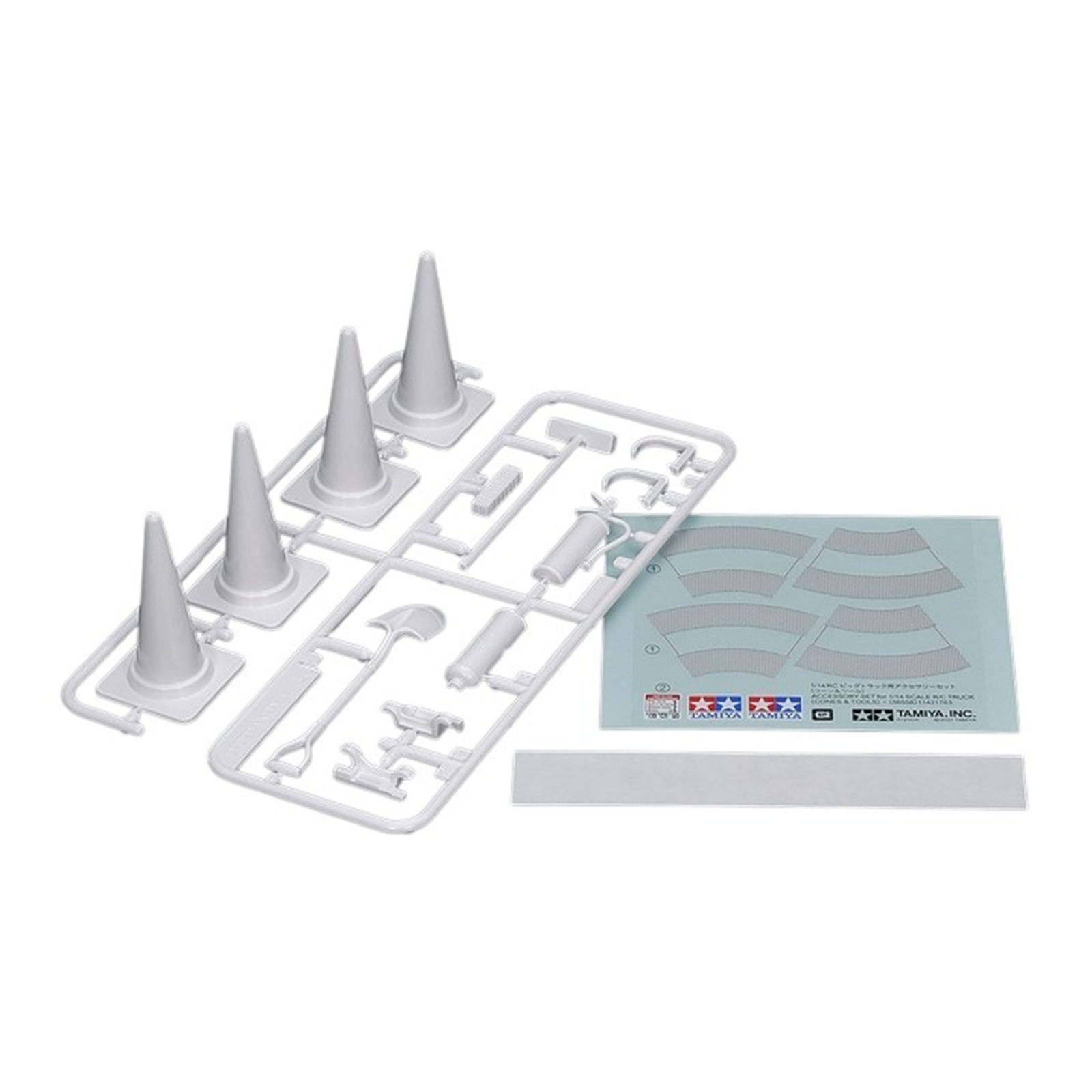 The Tamiya 56558 Accessory Set is designed to enhance the realism of your 1/14 scale R/C truck models. This set includes a shovel, fire extinguisher, deck brush, four cones, and stickers, allowing modelers to add authentic details to their R/C trucks.