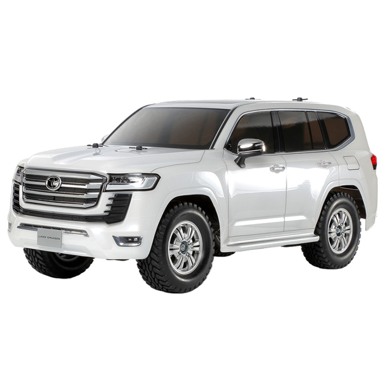 Since the first generation model release in 1951, the Toyota Land Cruiser has been one of the most famous 4WD vehicles in the world. This R/C model assembly kit recreates the Land Cruiser 300 series announced in 2021. The polycarbonate body realistically depicts the eye-catching, dignified form with separate parts to capture the distinctive large front grille's horizontal fins and metal-plated sections. Light case and door mirror components are metal-plated, and door handles and shark fin antenna on roof are rendered by separate parts for more realism. Silver color 12-spoke wheels are paired with block pattern tires.