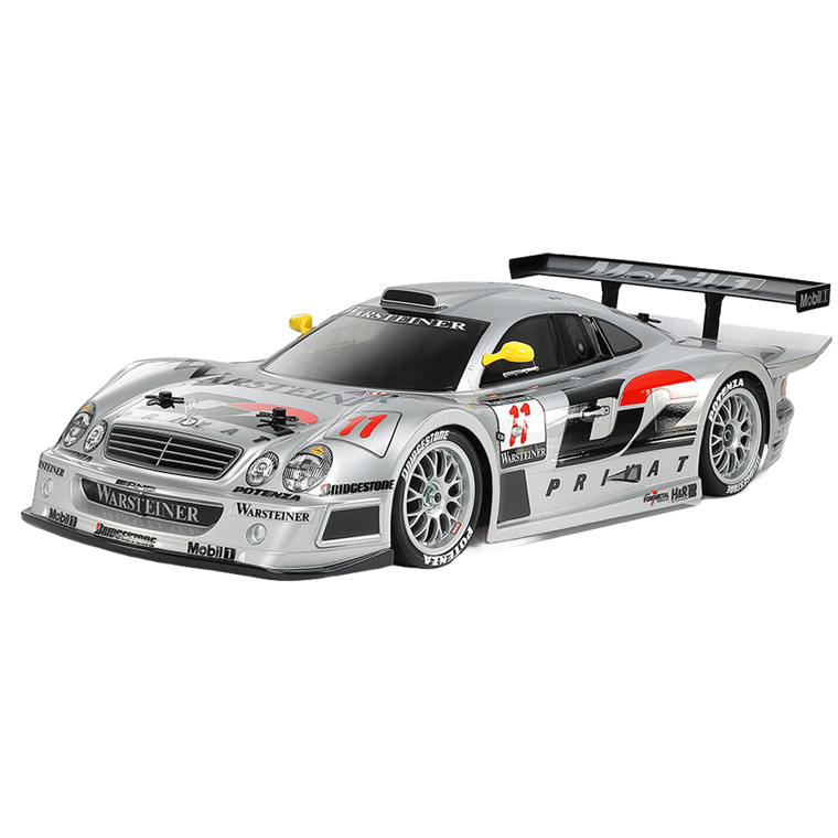 This R/C model assembly kit recreates the Mercedes-Benz CLK-GTR car which took six wins in dominating the 1997 FIA GT Championship. Although inheriting the 2-door coupe form and front section of its base road car, the racecar looked rather different and that aerodynamically honed form is recreated by a polycarbonate body, while separately molded components are used for the nose emblem, A pillar-mounted side mirrors, rear spoiler and rear wing. A full sticker sheet recreates this successful car's livery to round off the model.