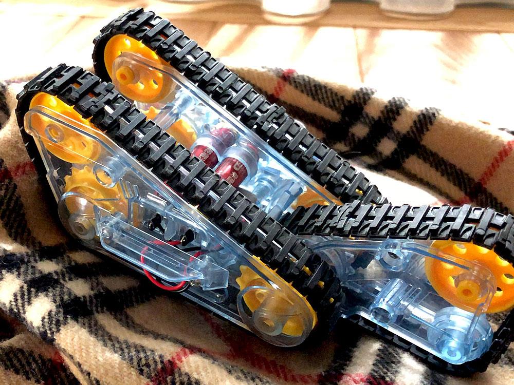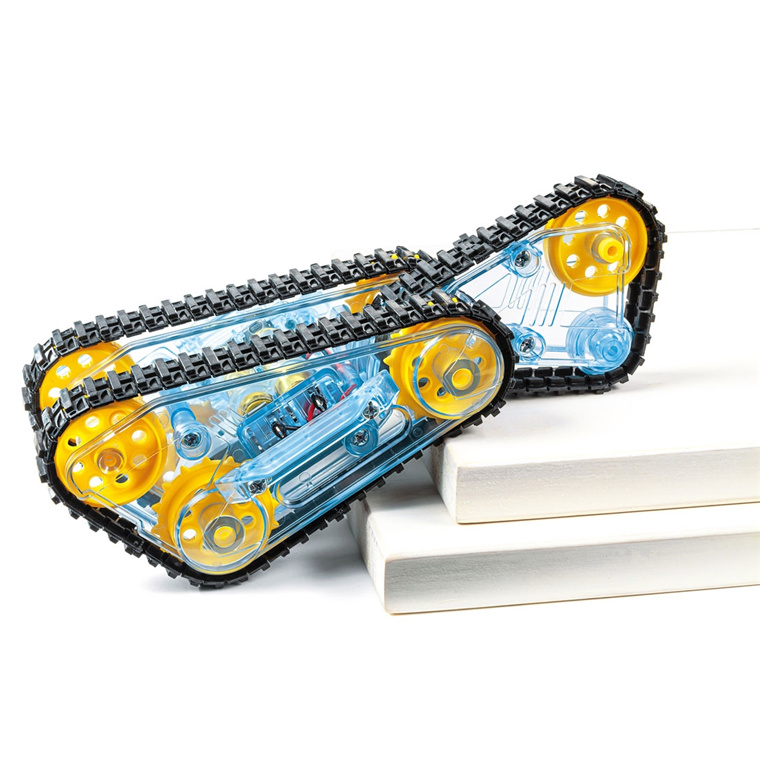 - This assembly kit creates a model that not only easily gets over obstacles and steps with three moving crawlers, but also is capable of reverse and running on its side.