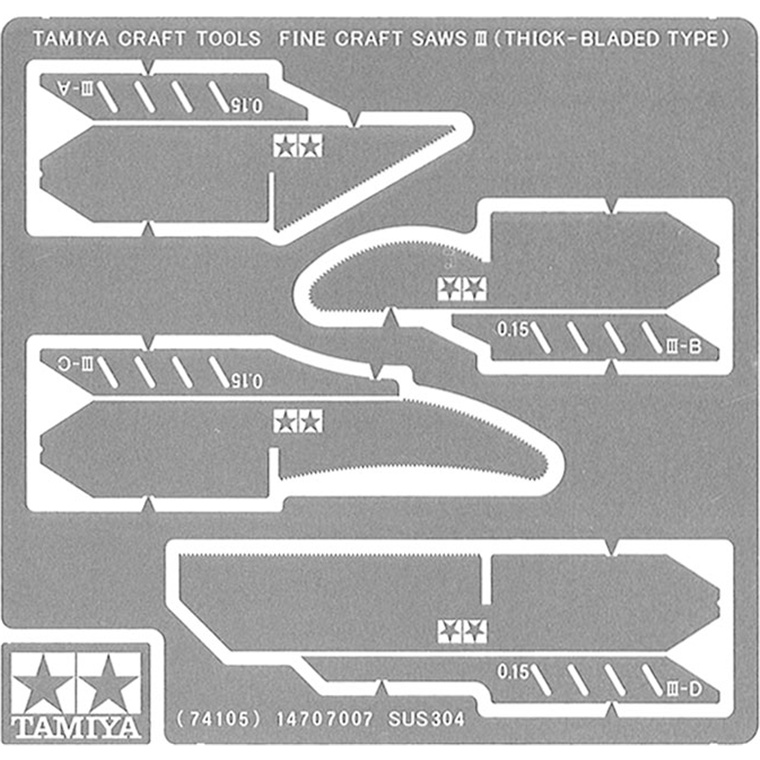 In some situations, the cut made by a normal modeling saw may be too wide, leading to unwanted changes to the length of the part. This set of saws solves this problem as they are made from 0.15mm thick etched metal. The grips of the saws can be folded over and attached to a Modeler's Knife (Tamiya 74040) for precise cutting control. The set includes four types of saw blades which can be used for a variety of situations.