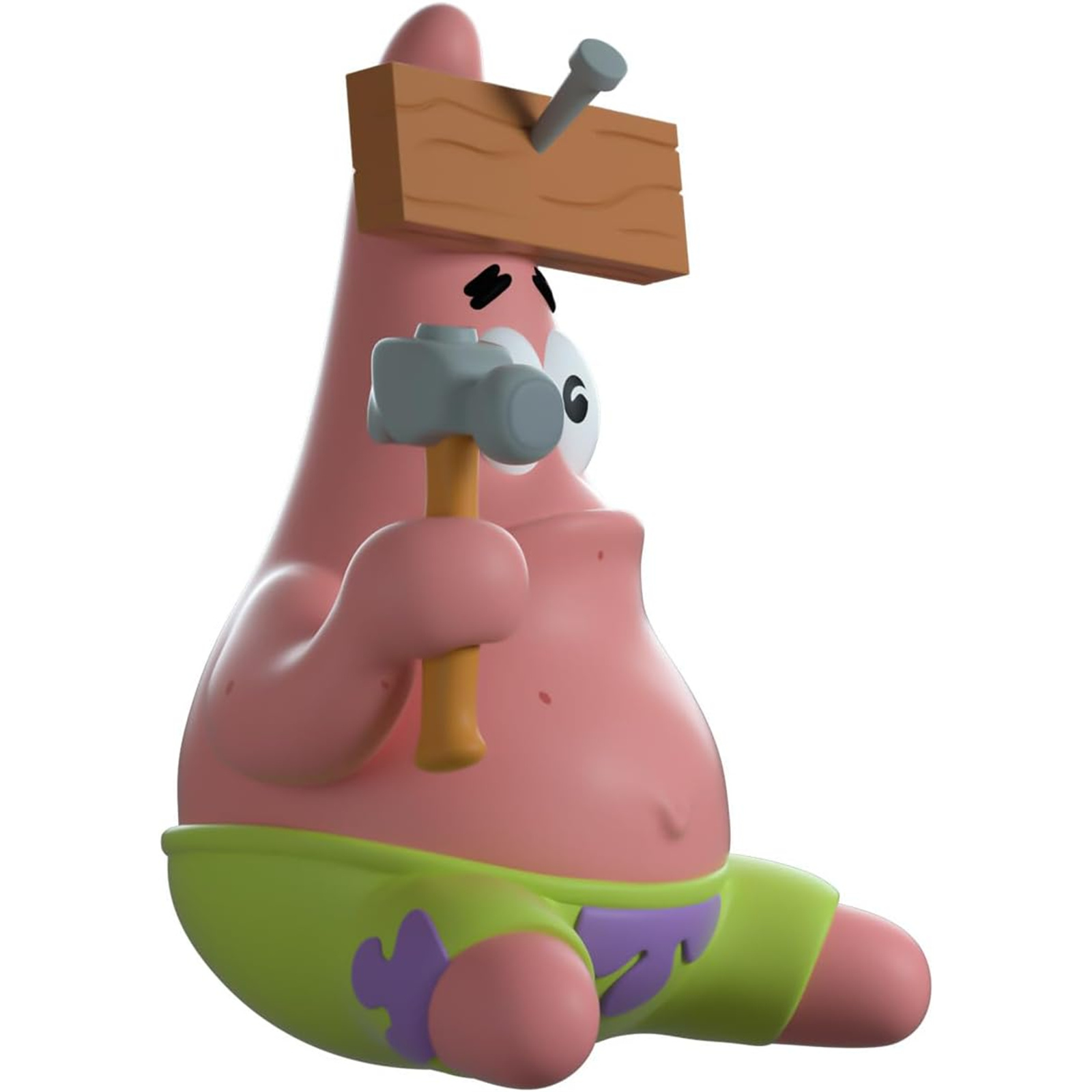 Seated with his legs stretched forward, Patrick wears his classic green and purple floral shorts. He holds a claw tooth hammer in his right hand, seemingly in the middle of a botched construction job. His blank-eyed stare and slight frown add to the comedic effect, making this figure a standout in any SpongeBob collection.