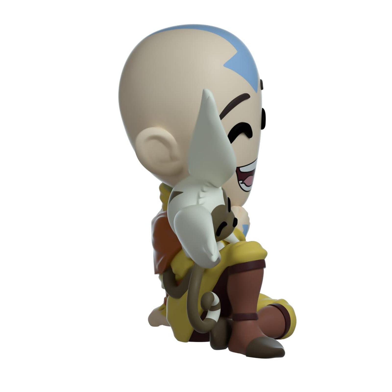 This collectible figure features Aang, the beloved protagonist from Avatar: The Last Airbender. Sitting comfortably on the floor with a joyful open-mouth smile, Aang is depicted in his classic yellow and orange attire. Cuddled under his arm is Momo, his loyal flying companion, with Momo's distinct brown and white tail playfully resting beside them. The figure stands 4 inches tall, capturing a moment of relaxation and charm.