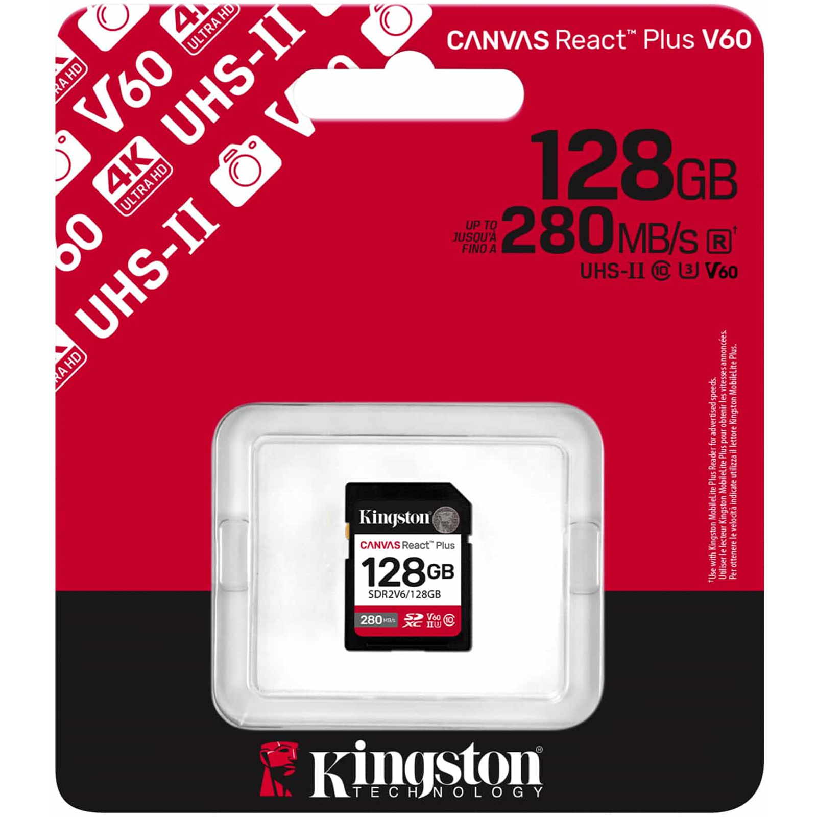 Kingston Canvas React Plus SDXC Memory Card - 128GB UHS-II - U3 - V60 - Read up to 280MB/s - Write up to 100MB/s - for DSLRs / Mirrorless Cameras & 4K Video Production