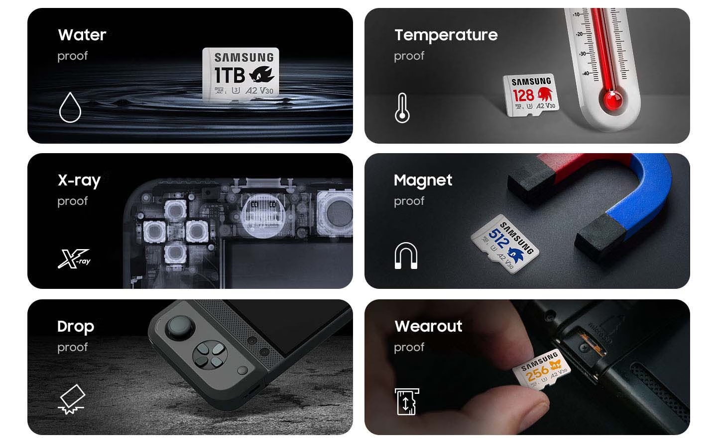 The Sonic the Hedgehog™ PRO Plus microSD card stands up to life's biggest bosses-like water and extreme temperatures. With 6 types of resistance, it can handle wear and tear for the ultimate win[2-9].