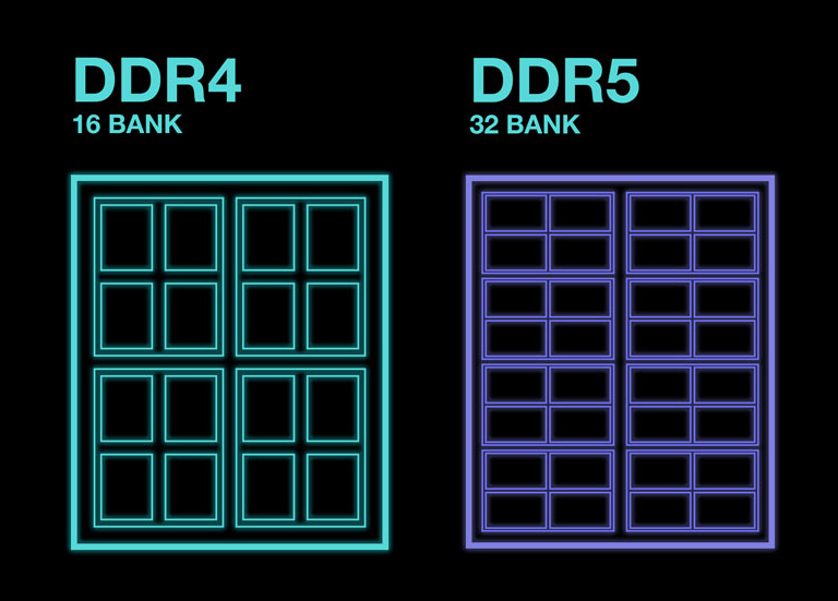 DDR5 allows up to 32 banks (storage units that can be enabled/disabled separately) comprised from 8 bank groups, doubling the access availability from the 16 banks available in DDR4 standards; the DDR5 burst length (amount of data that can be accessed from a single DRAM read/write command) is also twice as much as DDR4 burst lengths. We believe the strengthened DDR5 performance can ensure that our users enjoy a brand new experience.