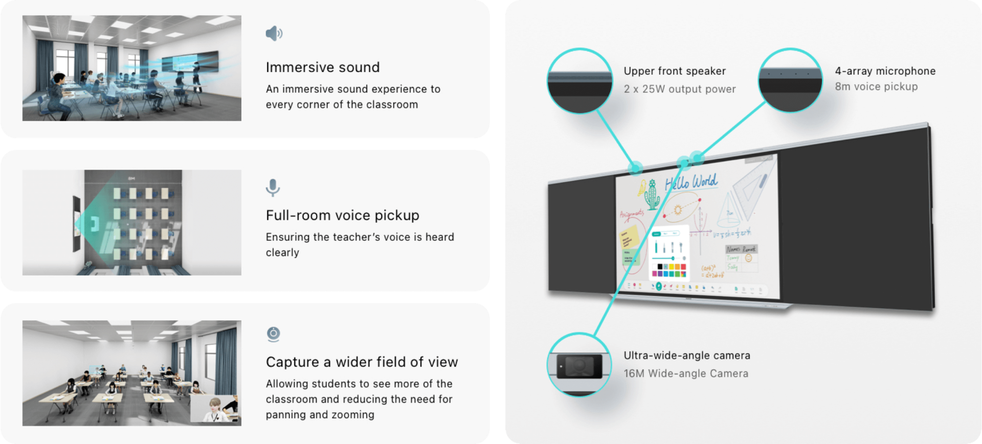 This all-in-one Smart Blackboard is equipped with a powerful camera, microphone and speaker, which facilitates more interactive learning experiences, including hybrid classes.