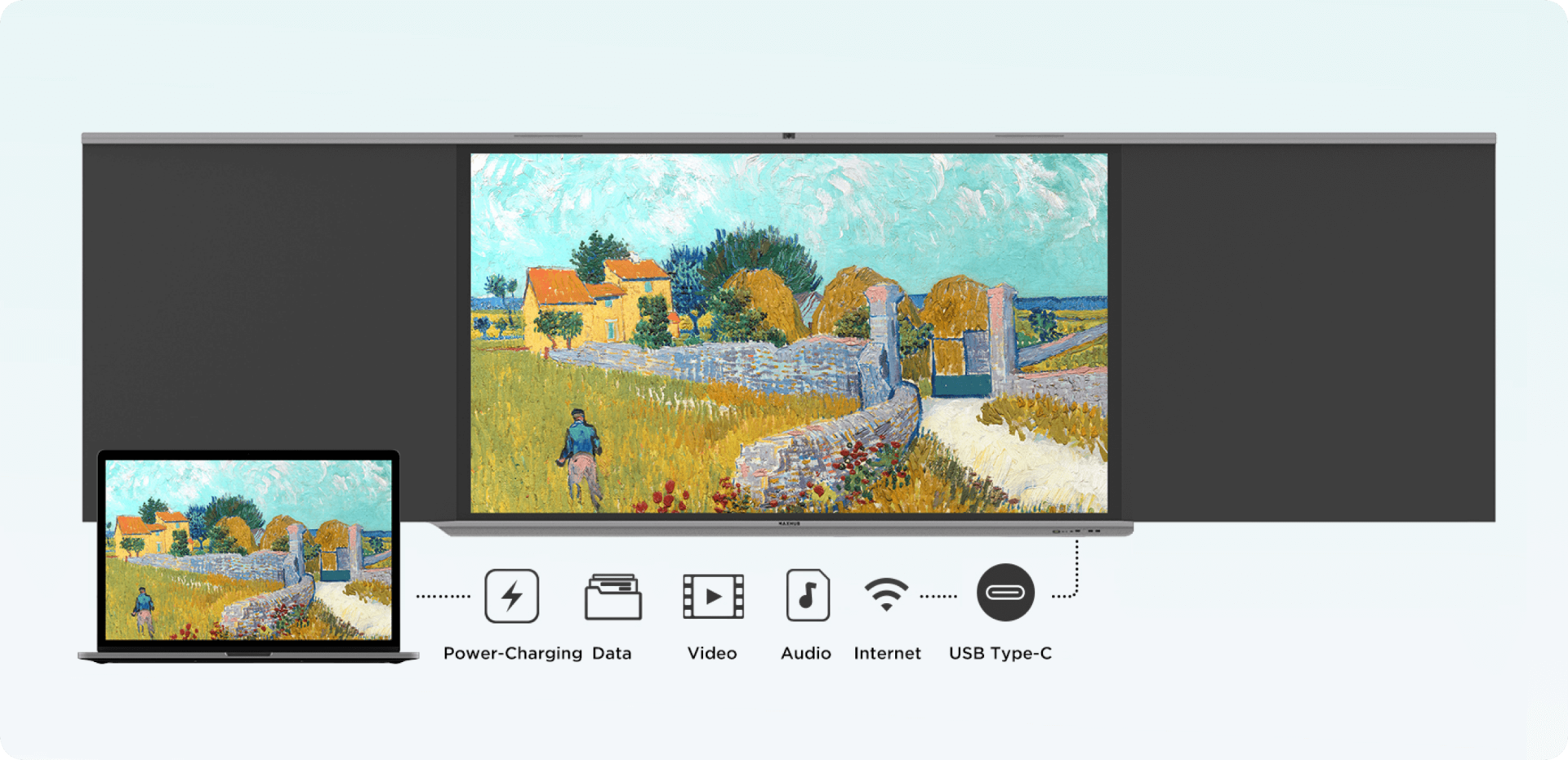 The all-in-one video, audio, touch, network and charging transmission is facilitated by the front-facing Type-C interface. It allows for audio and display support of up to 4K @ 60 fps and charging capabilities of up to 65W. It also allows laptop internet access.