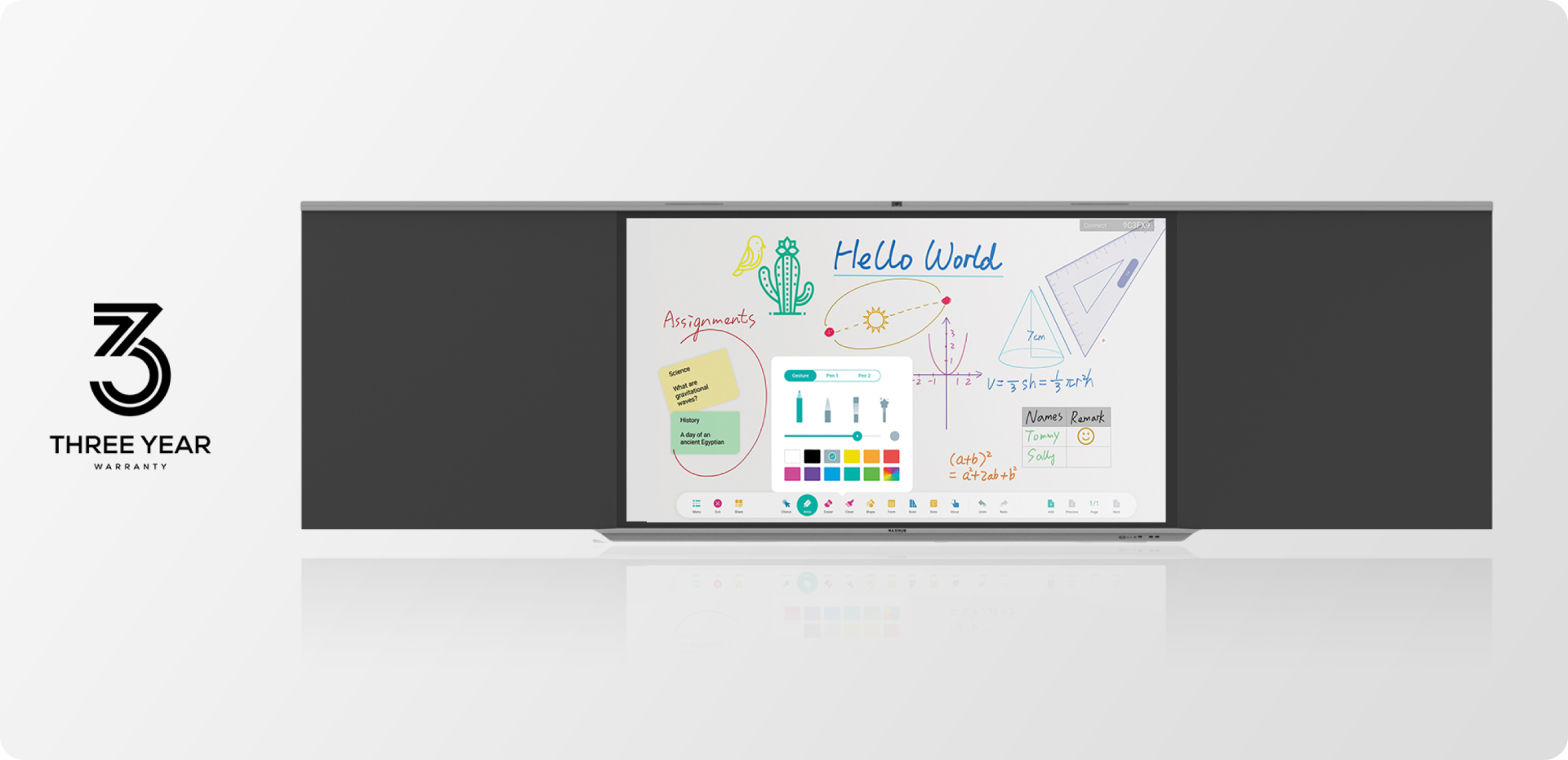 A seamless writing experience is offered across the entire screen, thanks to the screen's etched AG glass technology that supports smooth writing with various writing tools. These include original chalk, dustless chalk and liquid pens.