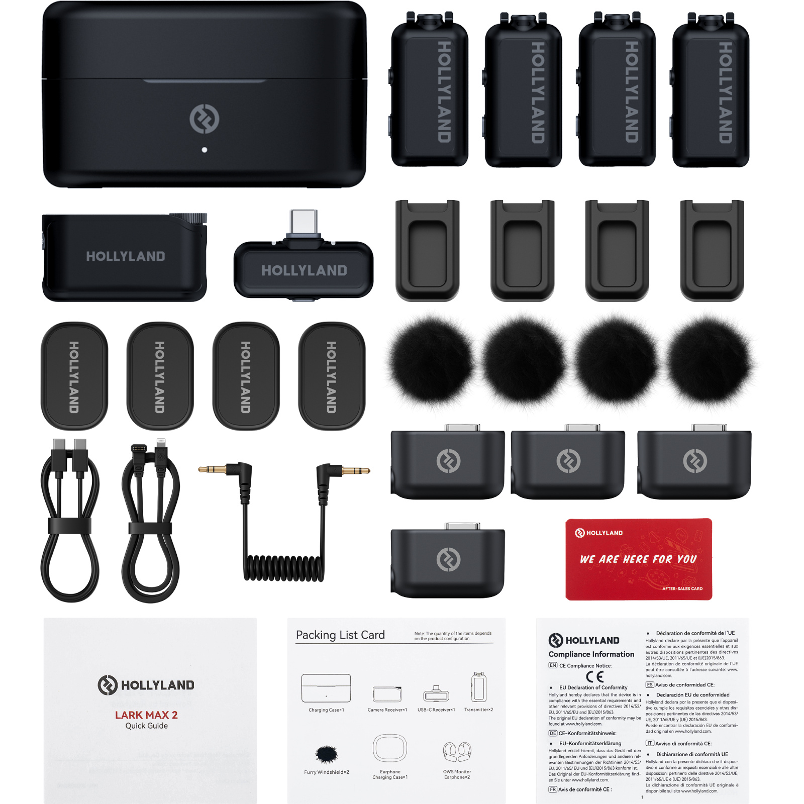 The Hollyland LARK MAX 2 Combo 4-Person is a feature-packed, user-friendly digital wireless microphone system with support for wireless monitoring designed for videographers, podcasters, streamers, and content creators. It lets you capture four on-camera voices with broadcast-quality sound straight out of the box-recording directly to cameras or USB-C/Lightning mobile devices. Delivering crystal-clear 32-bit/48 kHz audio throughout the entire signal chain, it captures every detail from recording to transmission to monitoring.