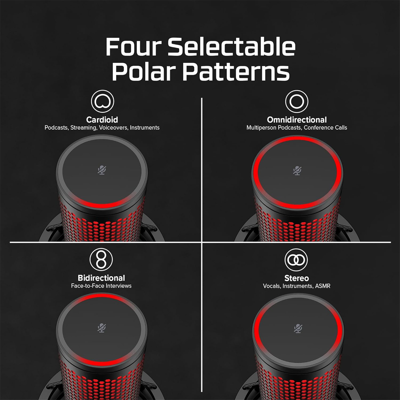 Optimize your recording by selecting whichever of the versatile QuadCast 2's polar patterns (cardioid, omnidirectional, bi-directional, or stereo) best suits your audio capture needs.
