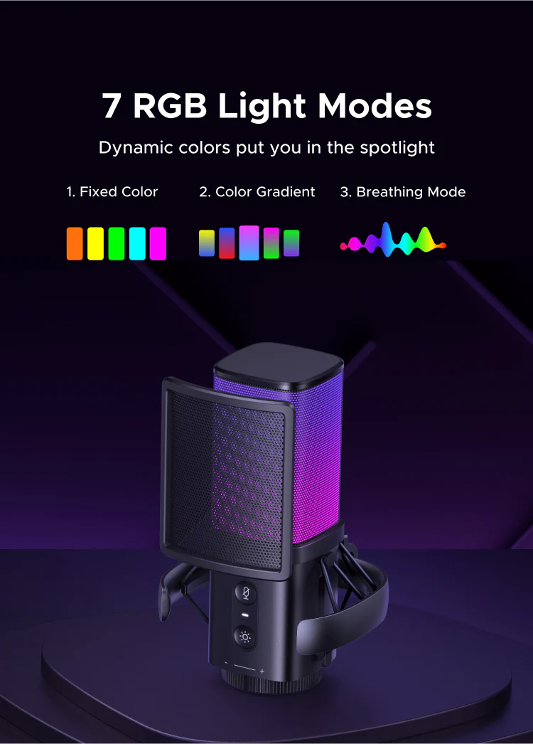 Cycle through 7 dynamic lighting modes-including a vibrant cycling rainbow, 5 solid colors (orange, yellow, cyan, blue, purple), and a smooth breathing effect-to match your content or mood. Instantly transform your streaming vibe with one tap using the desktop microphone.